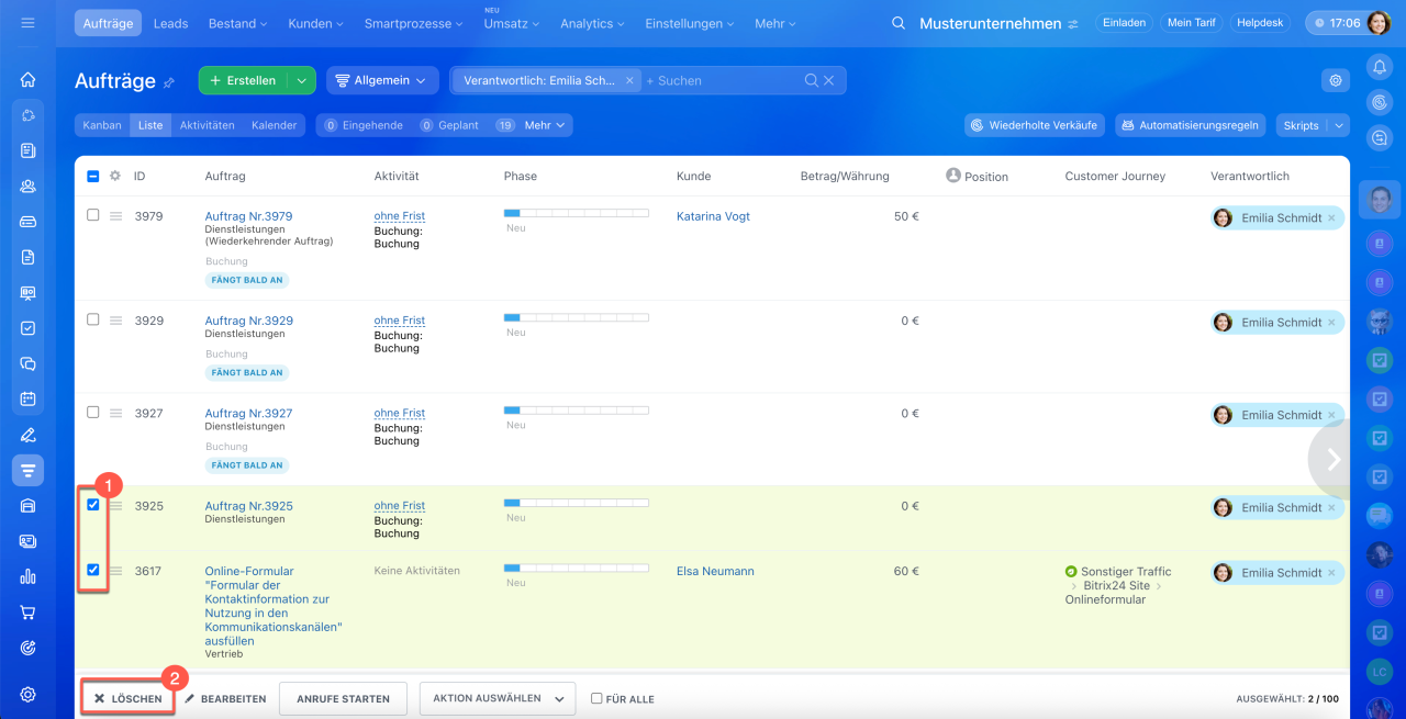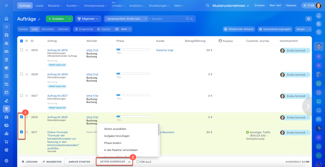 In der Liste können Sie mehrere Aufträge gleichzeitig bearbeiten – etwa die Phase ändern, den Verantwortlichen wechseln oder veraltete Einträge entfernen.