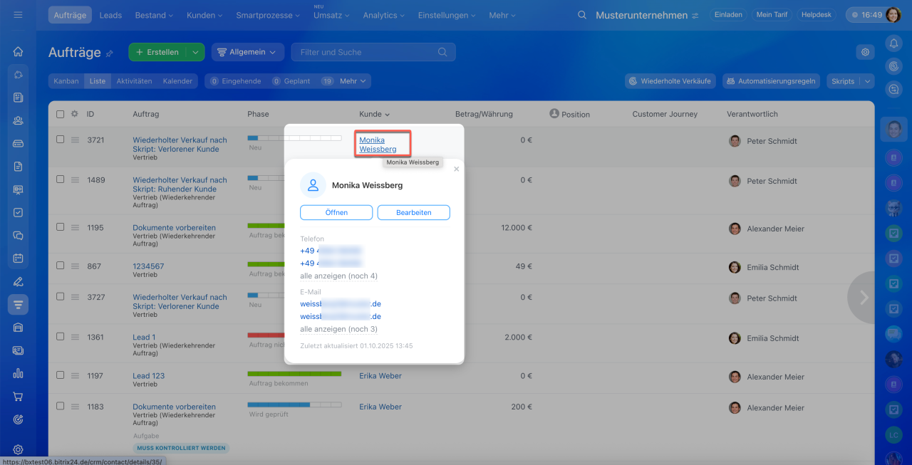 Kunden kontaktieren. Führen Sie den Cursor über den Namen des Kunden, um das Mini-Kundenformular mit den wichtigsten Daten zu öffnen: Kundentyp, Unternehmen, Telefon, E-Mail. Von dort aus können Sie direkt schreiben, anrufen oder zum vollständigen Formular wechseln.