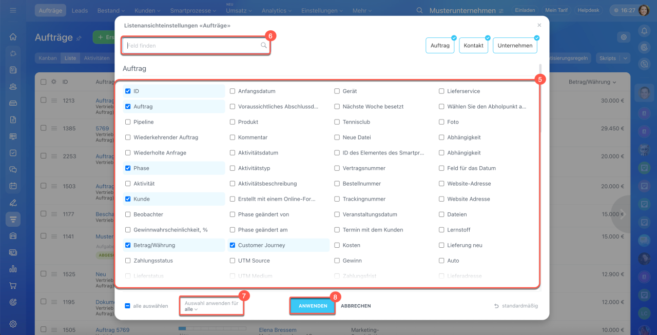 Wir zeigen die Einstellungen am Beispiel von Aufträgen – dieselben Schritte gelten für alle CRM-Elemente mit Listenansicht.