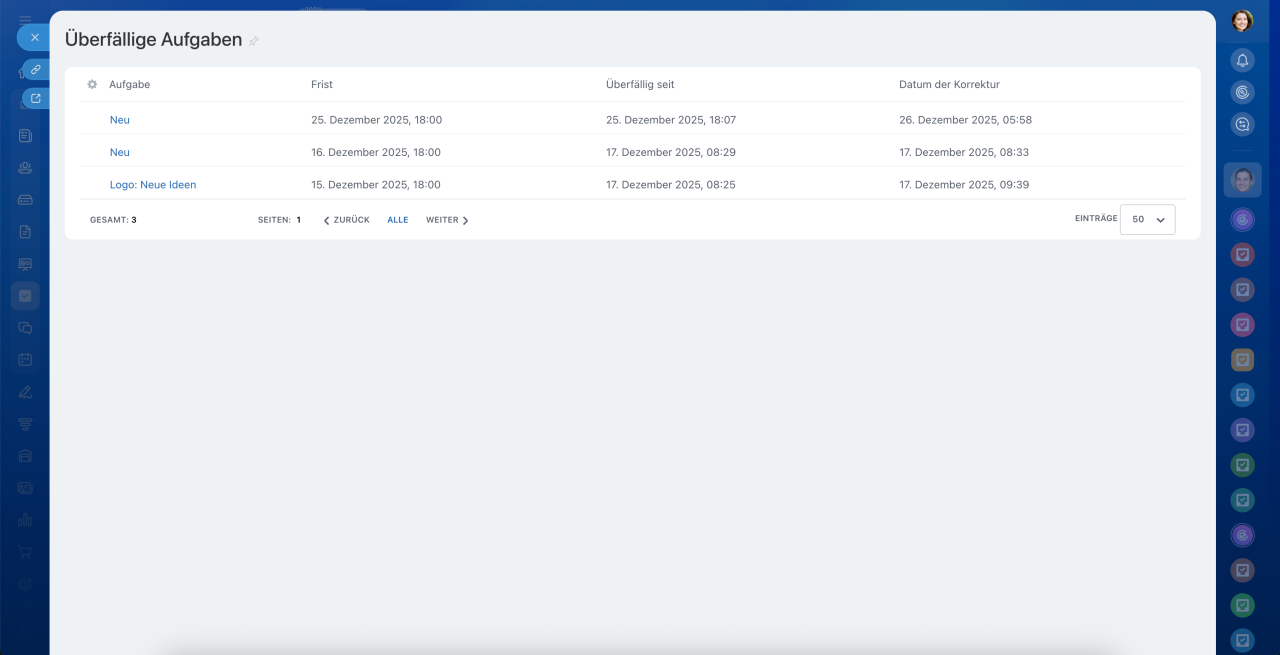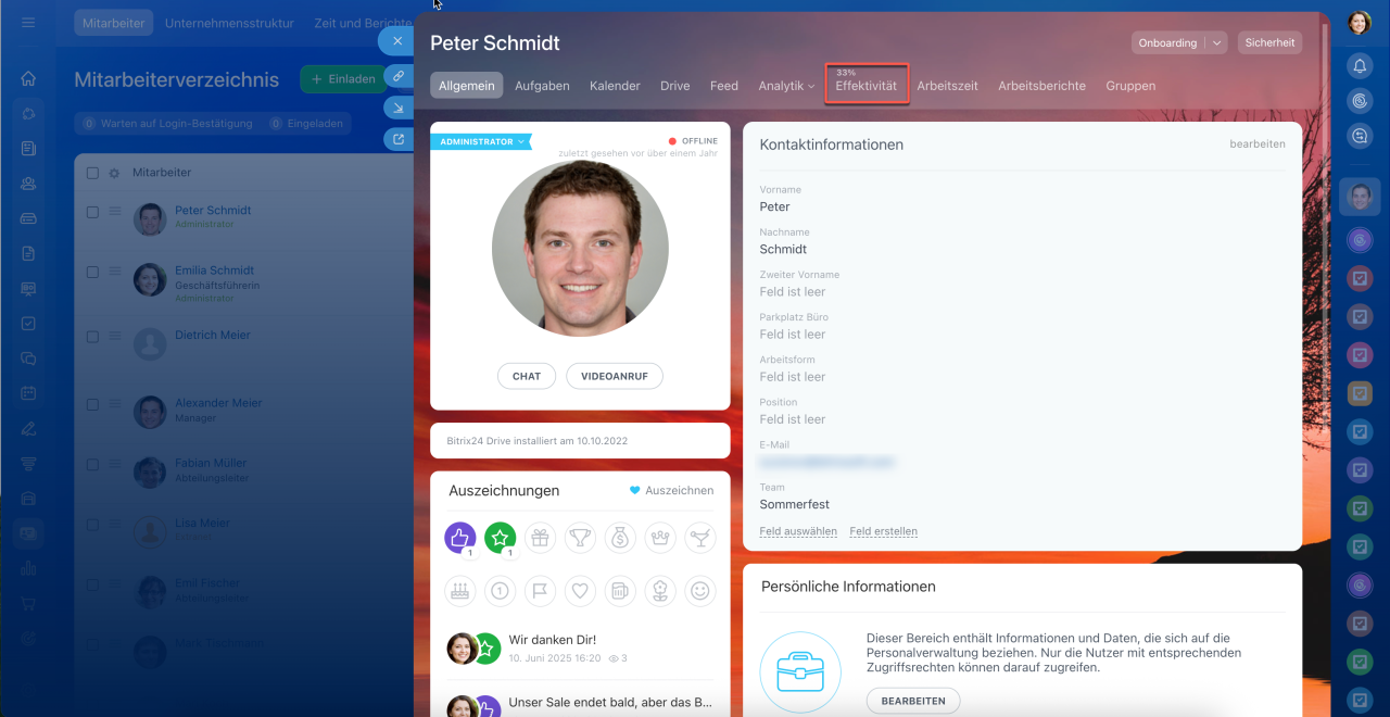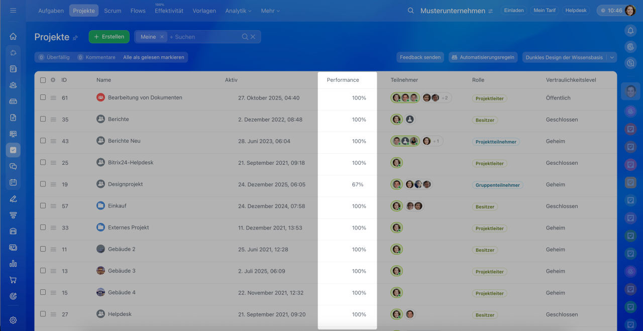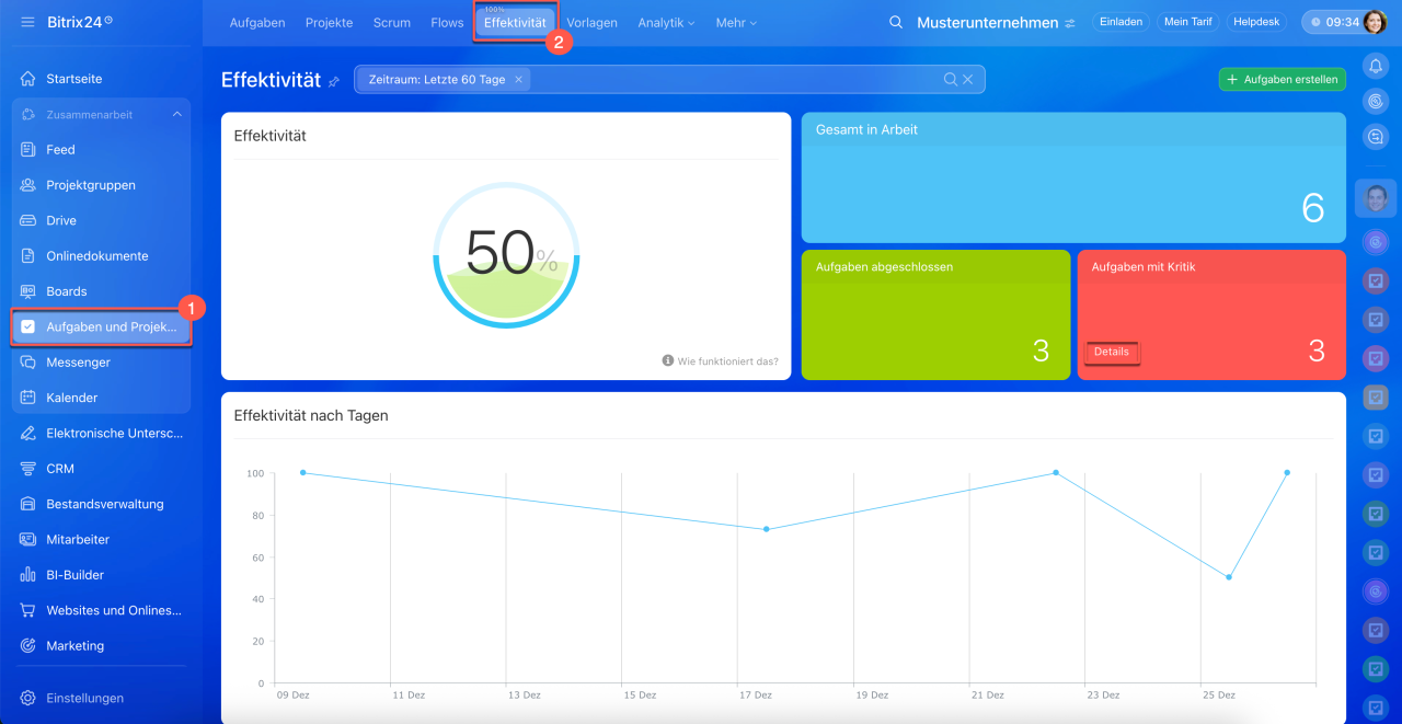 Bitrix24 bietet eine detaillierte Statistik zu Aufgaben für jeden Mitarbeiter. Diese Daten zeigen die Anzahl der laufenden, abgeschlossenen und überfälligen Aufgaben und helfen Führungskräften, die Produktivität ihres Teams zu bewerten. Mit dem Tool Effektivität können Sie erkennen, wer Aufgaben pünktlich und zuverlässig erledigt.