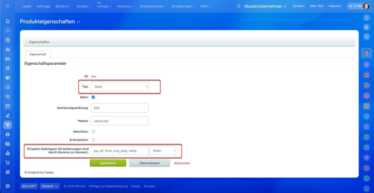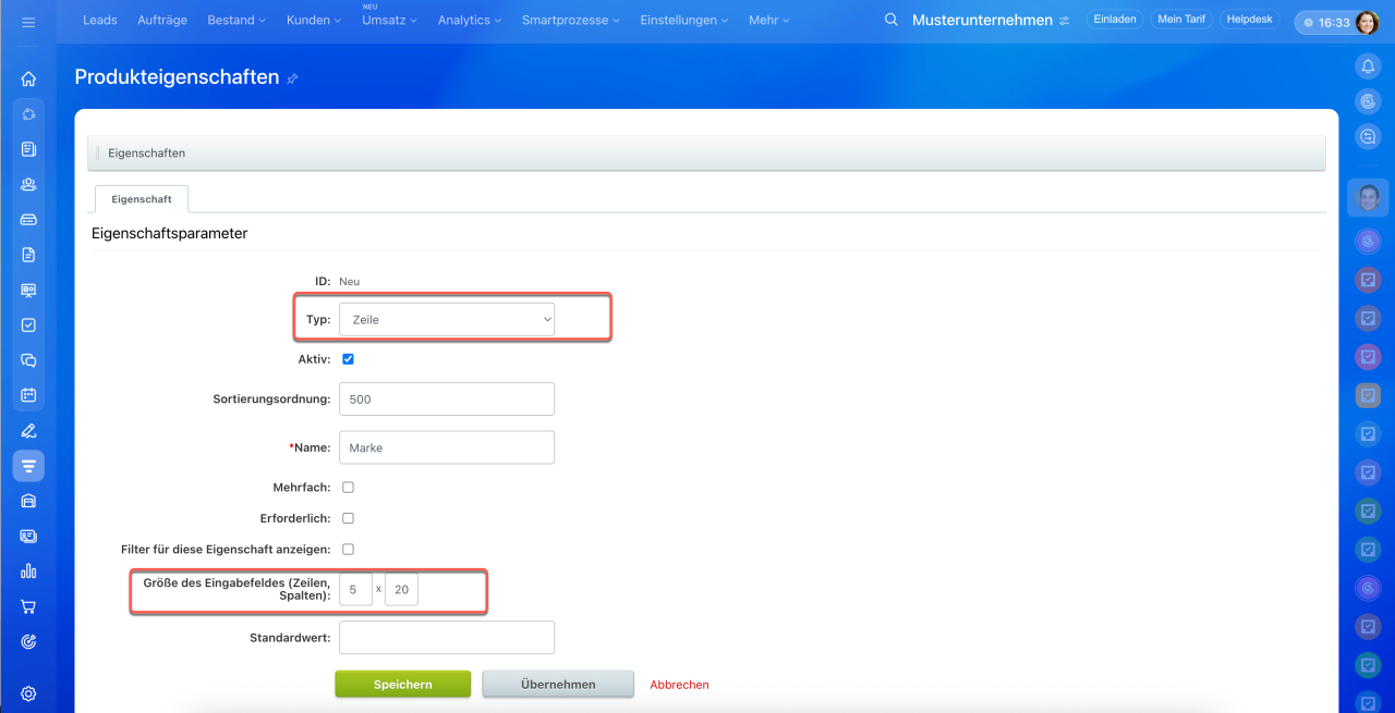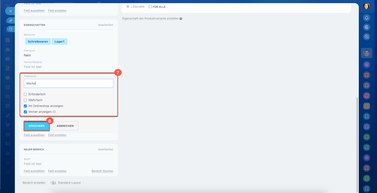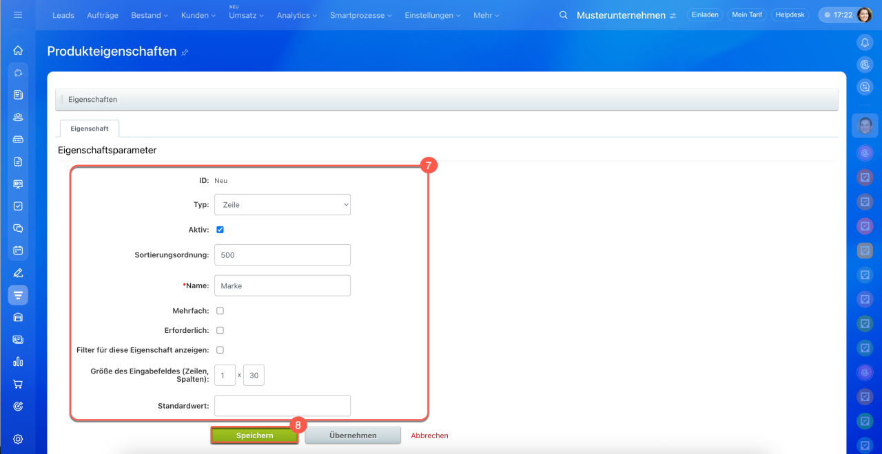 8. Änderungen speichern – die Eigenschaft wird zum Produkt- oder Dienstleistungsformular und zur allgemeinen Liste der Eigenschaften hinzugefügt.