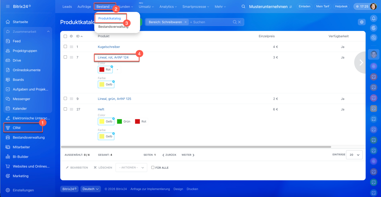 1–3. Öffnen Sie den Bereich CRM > Bestands > Produktkatalog.