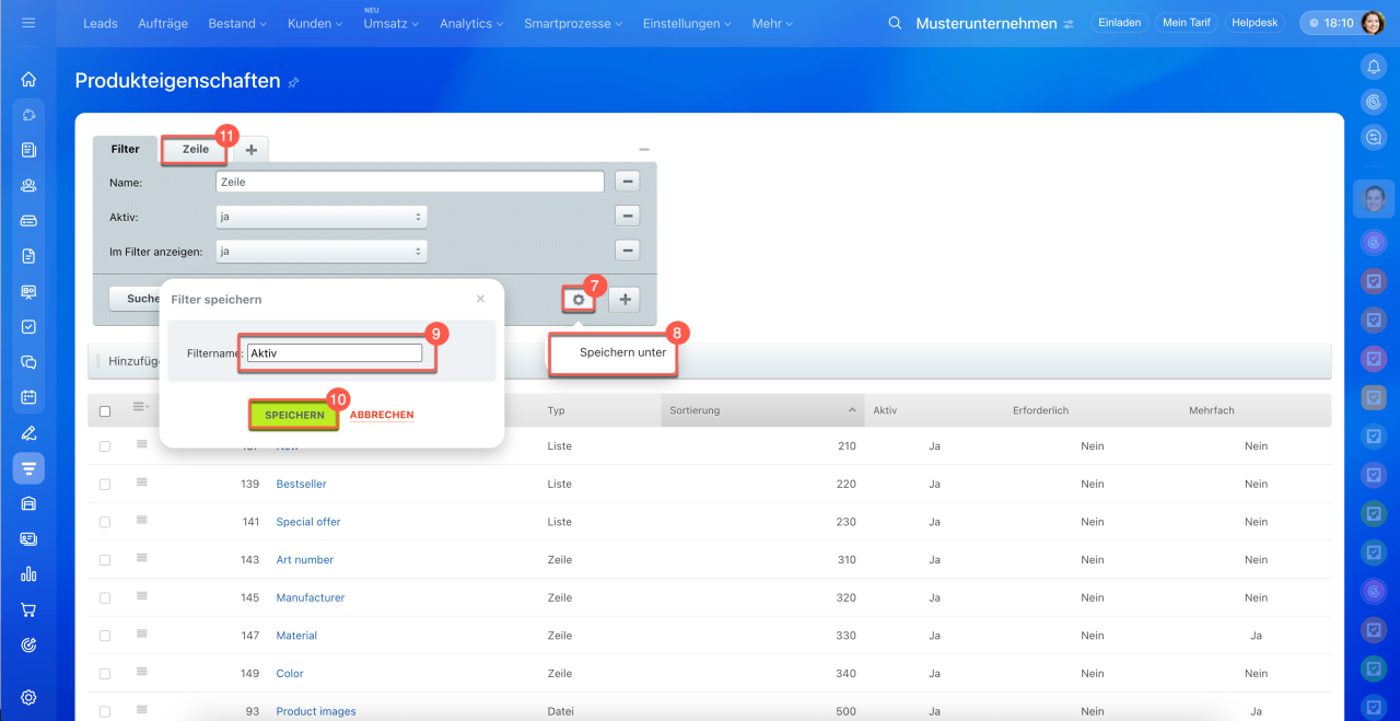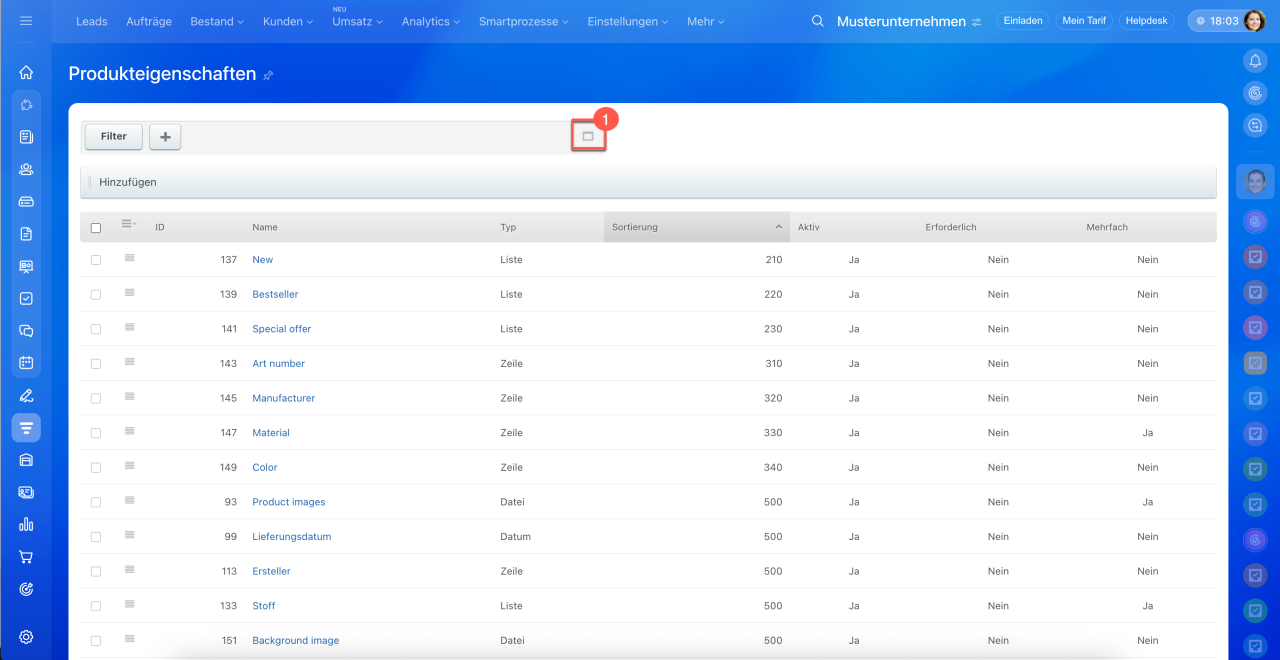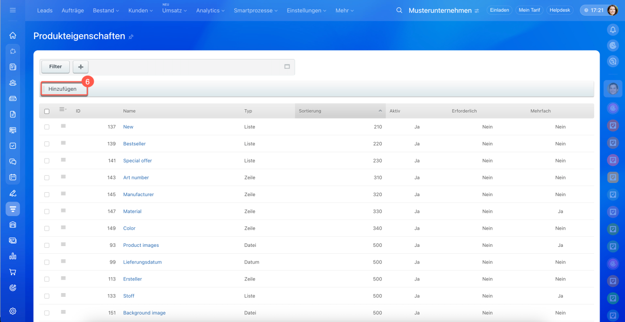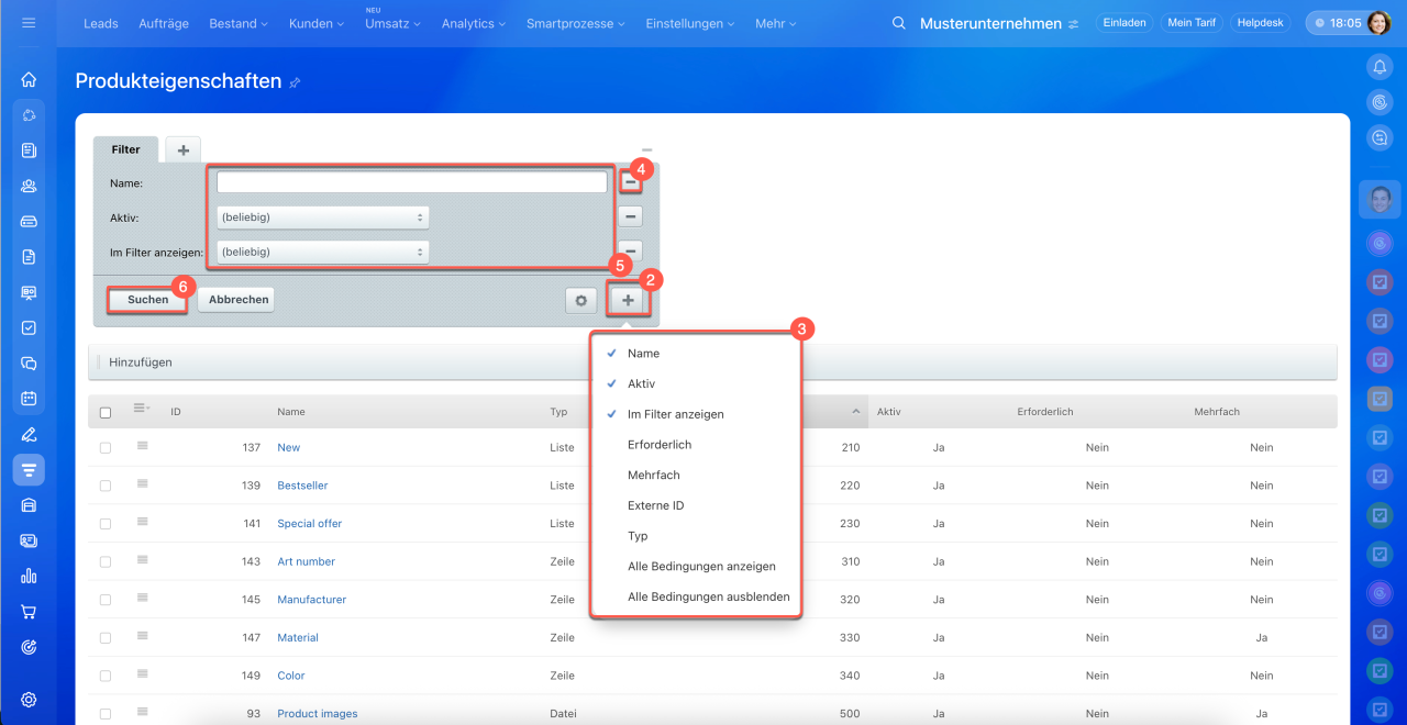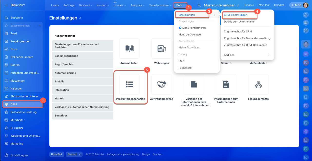 1–5. Öffnen Sie den Bereich CRM > Mehr > Einstellungen > CRM-Einstellungen > Produkteigenschaften.