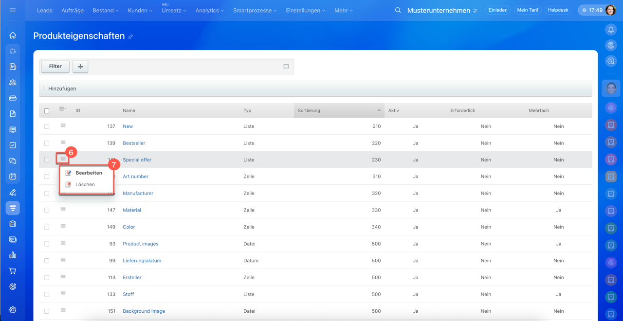 Im Produktformular können Sie die Einstellungen einer Eigenschaft bearbeiten. In den CRM-Einstellungen haben Sie zusätzlich die Möglichkeit, Eigenschaften zu bearbeiten oder zu löschen.