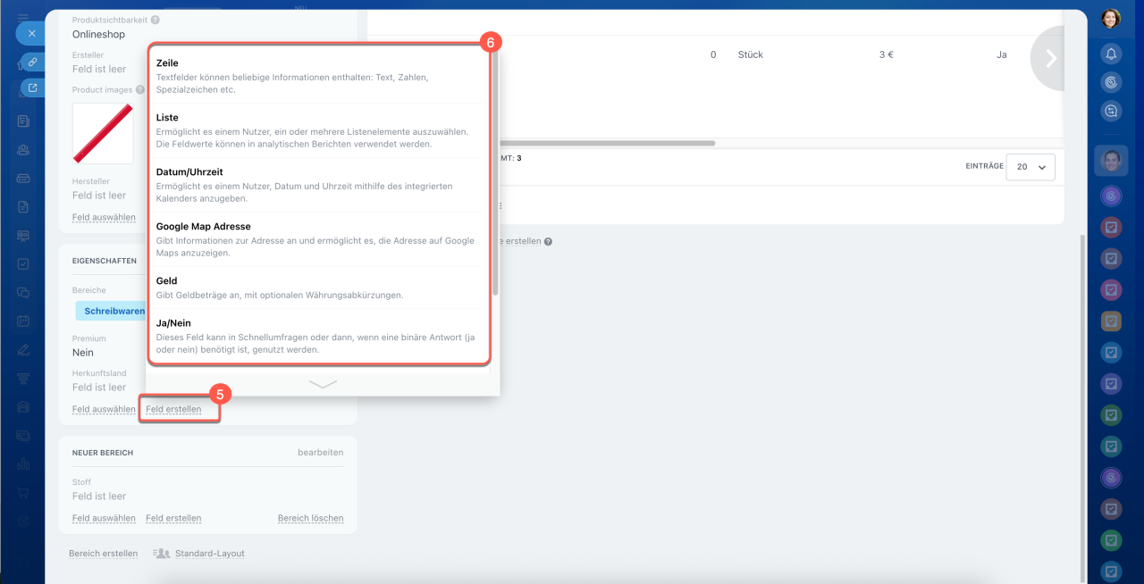 4–6. Klicken Sie im Produktformular auf Feld erstellen und wählen Sie den Typ aus.