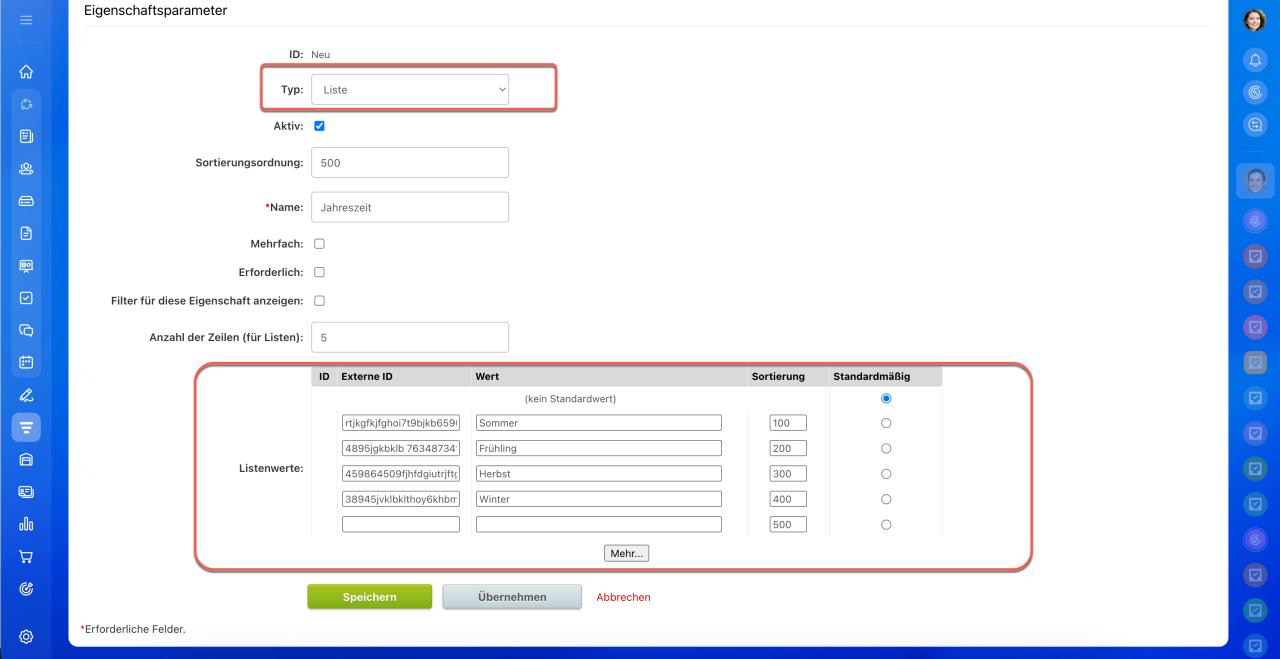 - ID – der interne Code der Eigenschaft, der automatisch vergeben wird. Eine manuelle Änderung ist nicht möglich.
