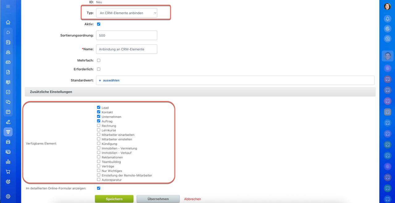 An Element anbinden. Die Option Verfügbares Element: bestimmt, mit welchen CRM-Elementen das Produkt oder die Dienstleistung verknüpft werden kann, um schnell darauf zuzugreifen.