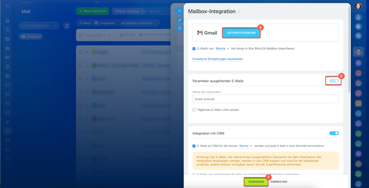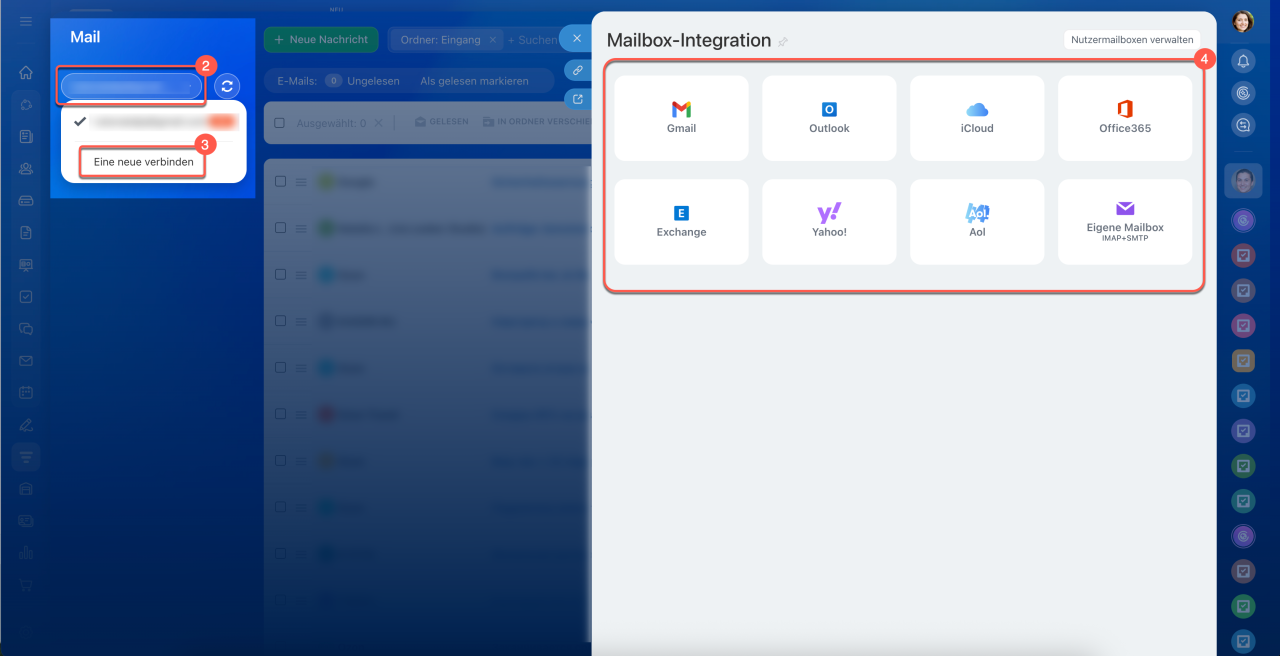 Ein E-Mail-Konto, das im Bereich Webmail hinzugefügt wird, eignet sich sowohl für den Empfang als auch für den Versand von E-Mails. Jeder Mitarbeiter kann es verbinden, sofern der Bitrix24-Administrator keine Einschränkungen vorgenommen hat.