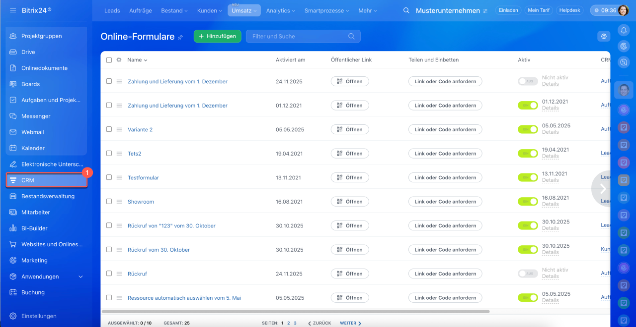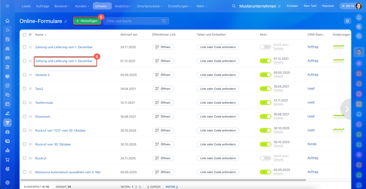 1–4. Öffnen Sie den Bereich CRM > Umsatz > Vertriebskanäle > Online-Formulare.