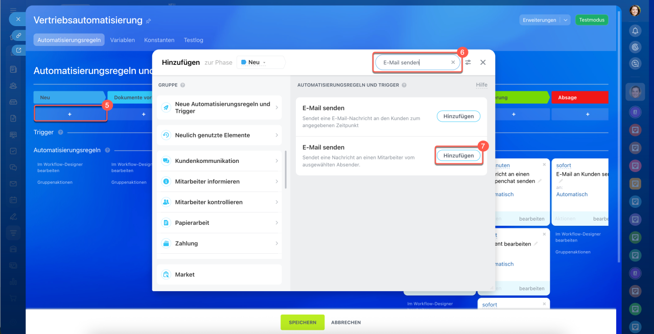 6–7. Geben Sie im Suchfeld den Begriff E-Mail senden ein. Fügen Sie die Automatisierungsregel hinzu – daraufhin öffnet sich ein Fenster zur Konfiguration.