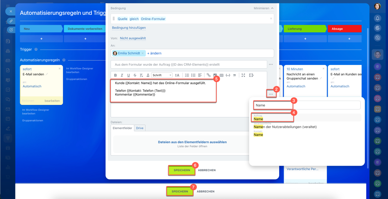 - Konfigurieren Sie die Automatisierungsregel: geben Sie die Parameter an und fügen Sie Werte aus CRM-Feldern in Betreff und Text der E-Mail ein. Verwenden Sie Felder aus denselben Elementen wie im Online-Formular.