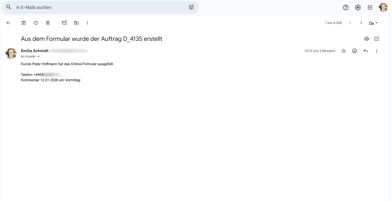 Wenn ein Kunde das Formular ausfüllt, werden die Daten im CRM gespeichert. Im entsprechenden CRM-Bereich wird ein Element erstellt, und die Automatisierungsregel sendet eine E-Mail mit den Daten aus diesem Onlineformular an die E-Mail-Adresse des Mitarbeiters.