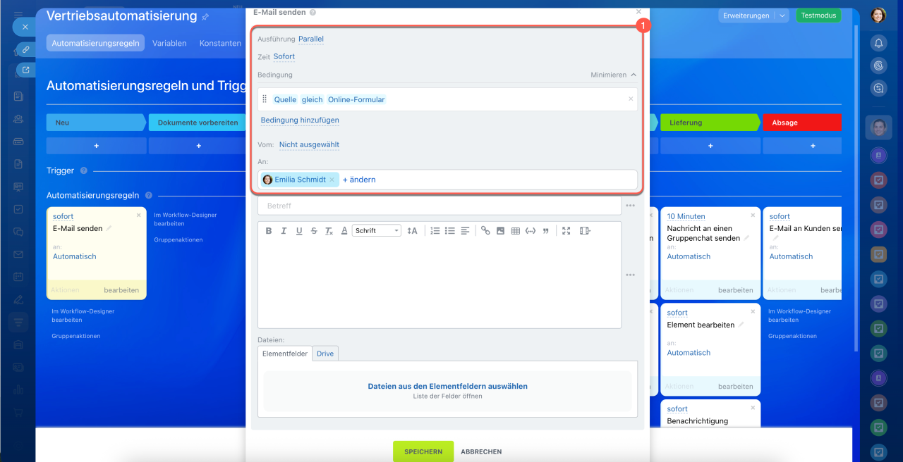 - Erstellen Sie die Automatisierungsregel E-Mail senden in der ersten Phase des CRM-Elements, das vom Formular erstellt wird.