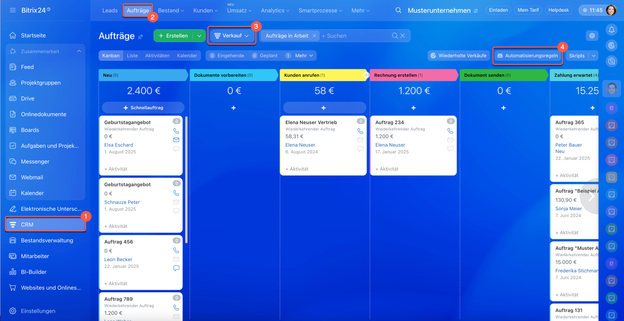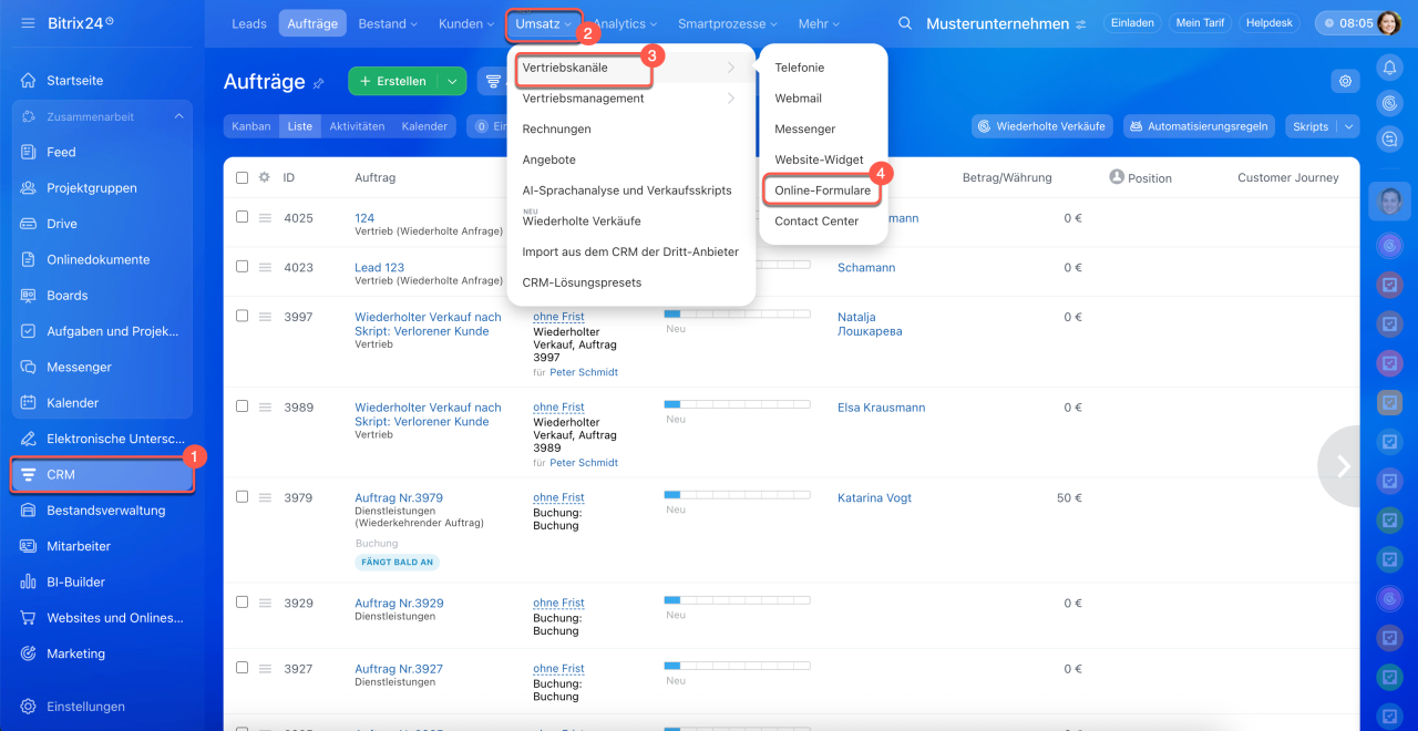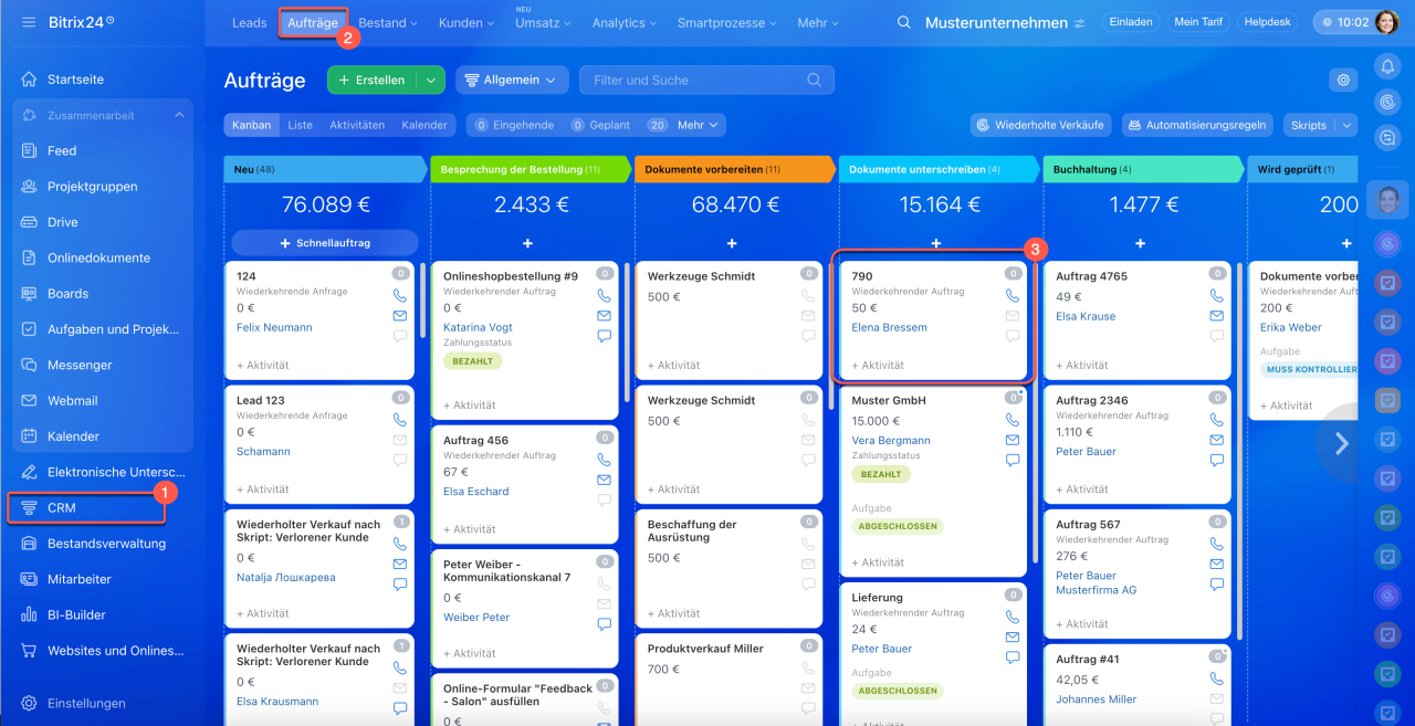 1–2. Öffnen Sie den Bereich CRM und wählen Sie das gewünschte Element aus, zum Beispiel Aufträge.