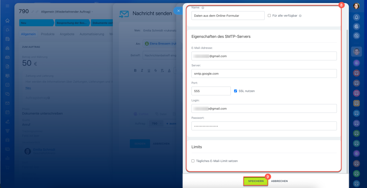 8–9. Tragen Sie die SMTP-Server-Daten ein und bestätigen Sie mit Speichern.