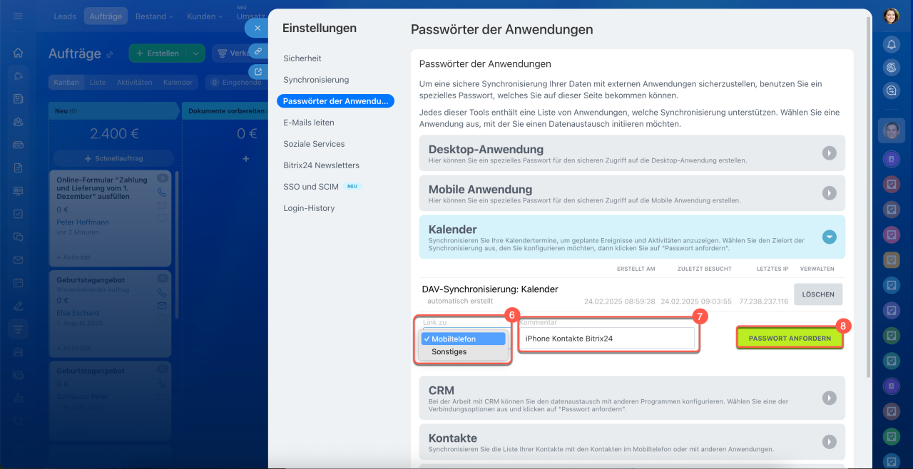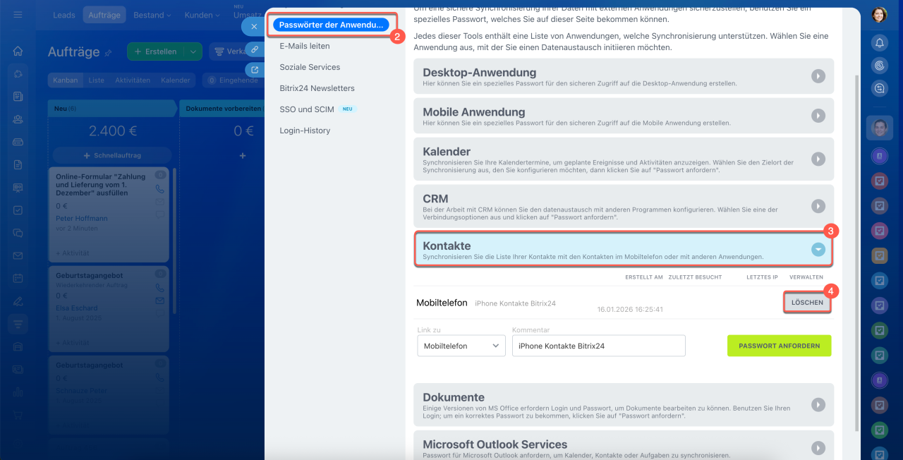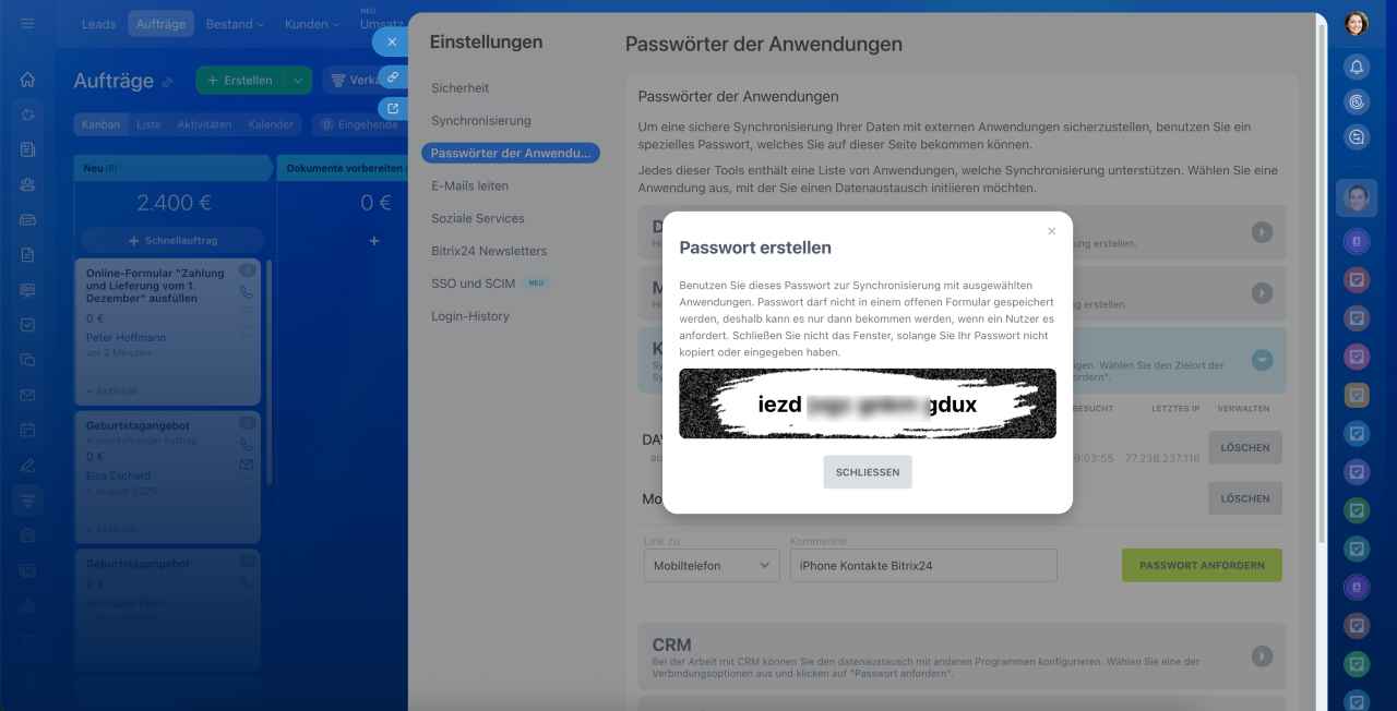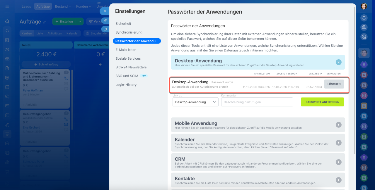 In einigen Diensten werden Anwendungspasswörter automatisch erstellt — beispielsweise bei der Anmeldung in Bitrix24 auf einem Computer oder in der mobilen App. Eine zusätzliche Einrichtung ist nicht erforderlich: Bitrix24 generiert das Passwort automatisch und nutzt es für die Verbindung.