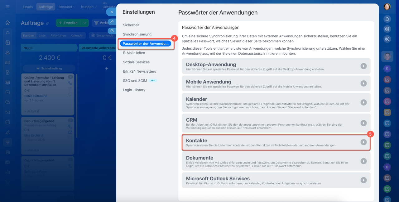 4–5. Klicken Sie auf Anwendungspasswörter und wählen Sie aus, wofür die Synchronisierung eingerichtet werden soll, z. B. Kontakte.