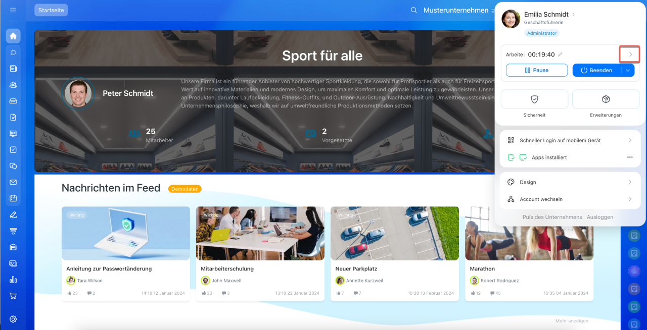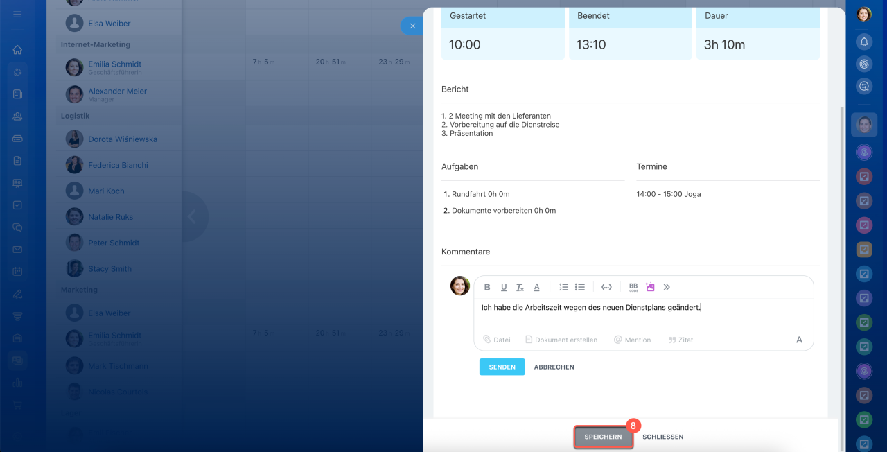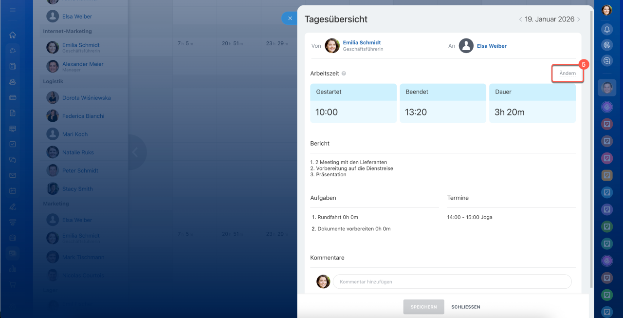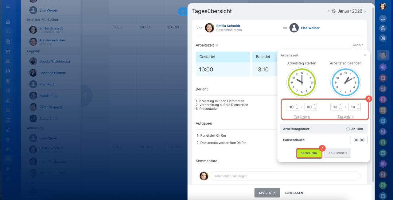 Der Bericht im Bereich „Arbeitszeit“ kann direkt im Widget des Mitarbeiters ausgefüllt werden. Klicken Sie auf den Pfeil und wechseln Sie zur Registerkarte Tagesübersicht. Hier trägt der Mitarbeiter ein, welche Aufgaben an diesem Tag erledigt wurden.