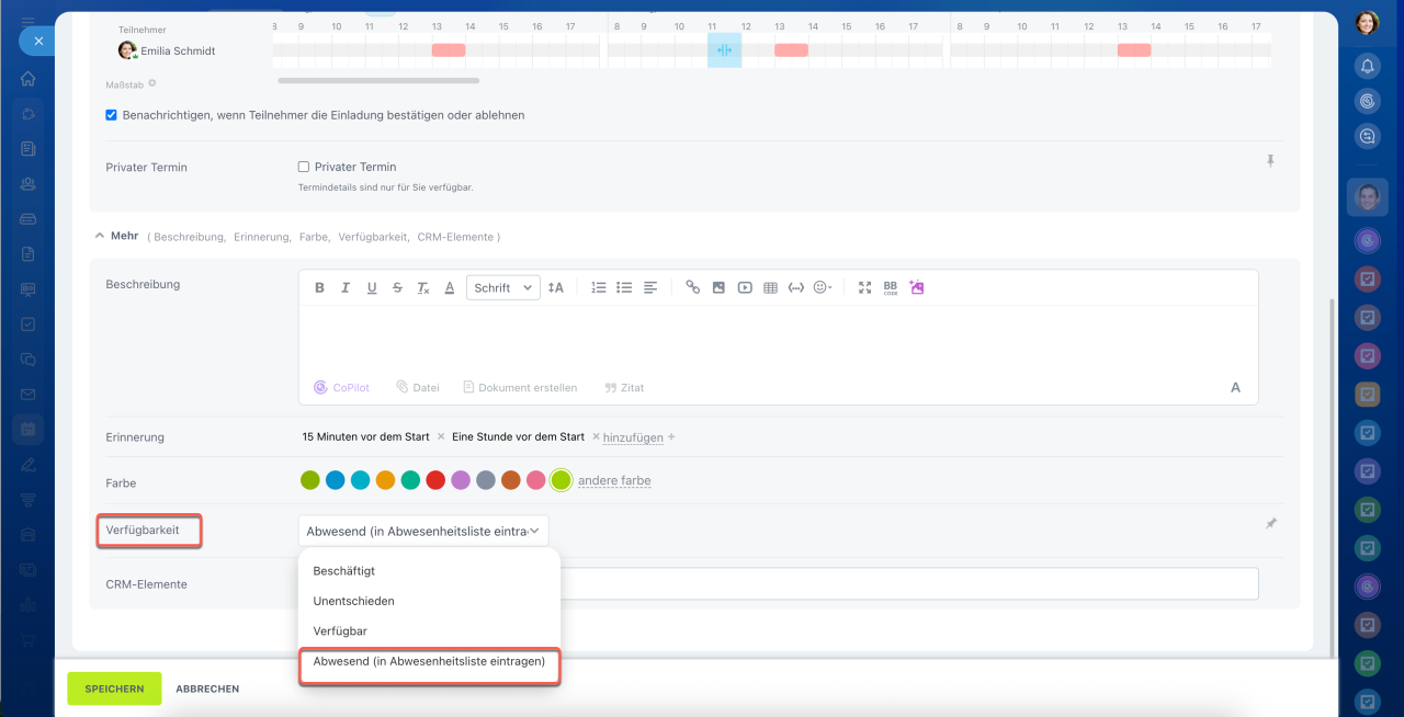 Kalender: Erstellen Sie einen Termin im Kalender. Wählen Sie im Feld Verfügbarkeit die Option Abwesend (In Abwesenheitsliste eintragen).