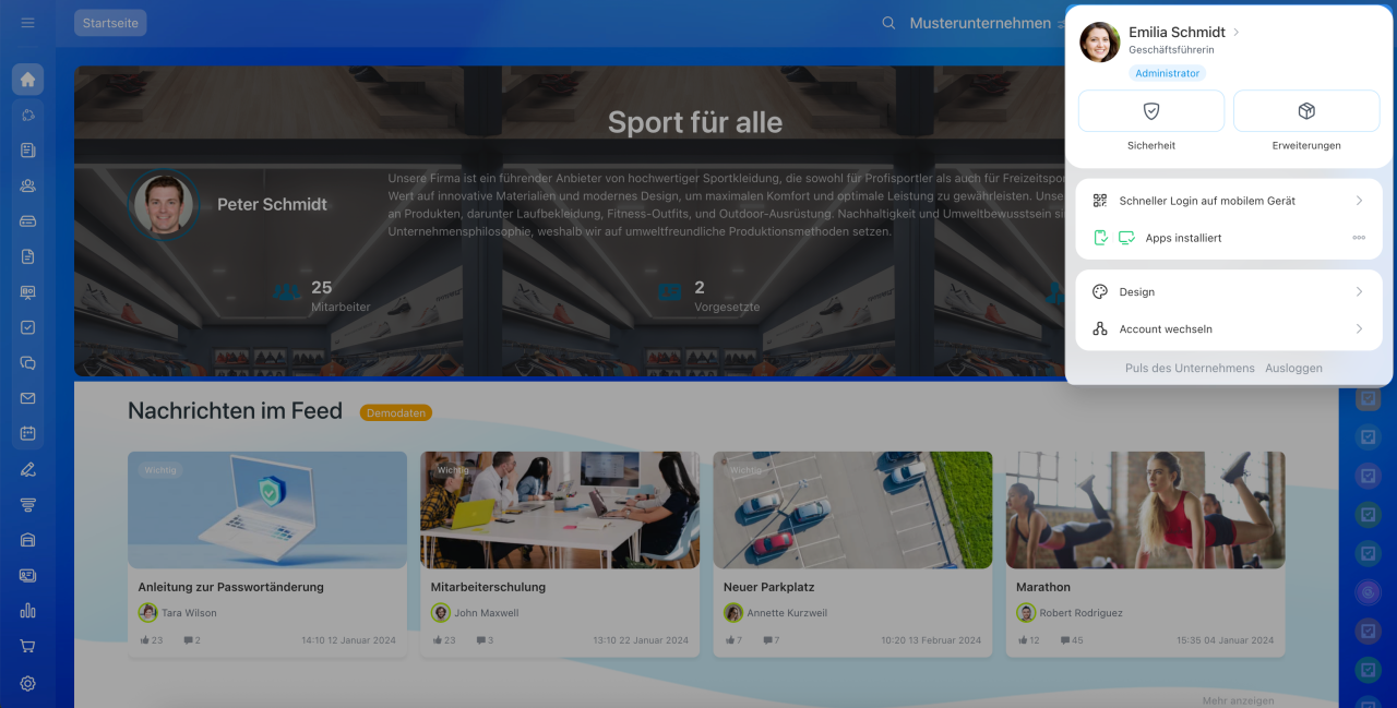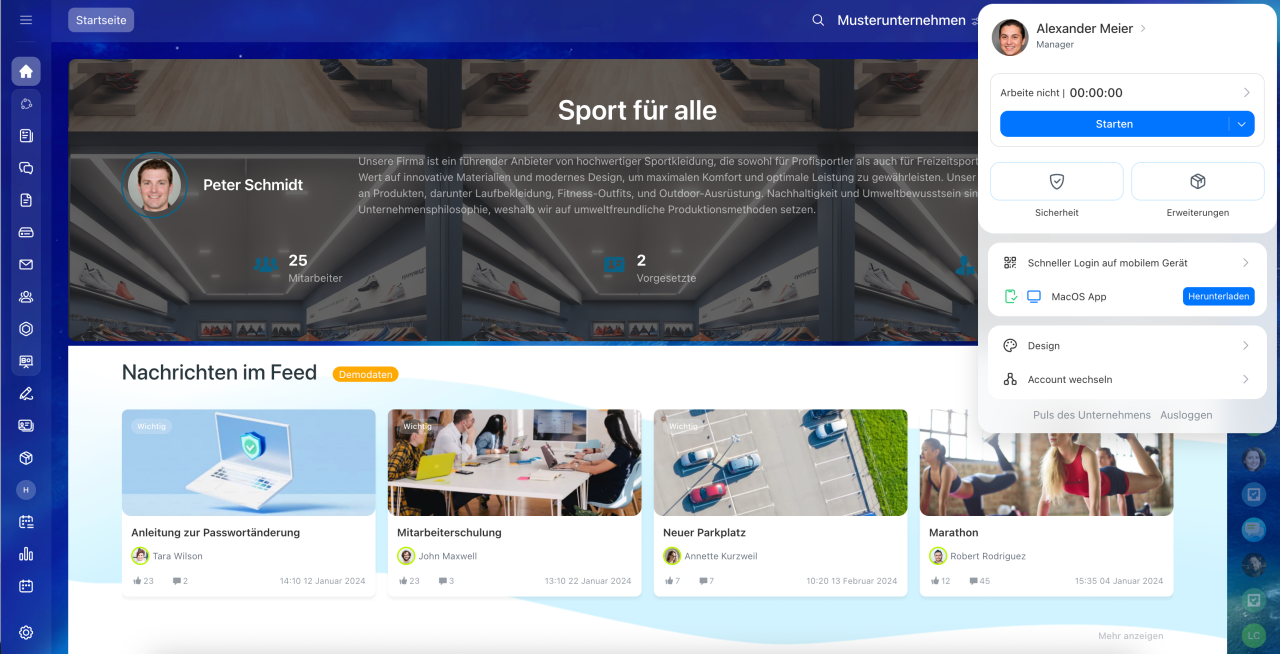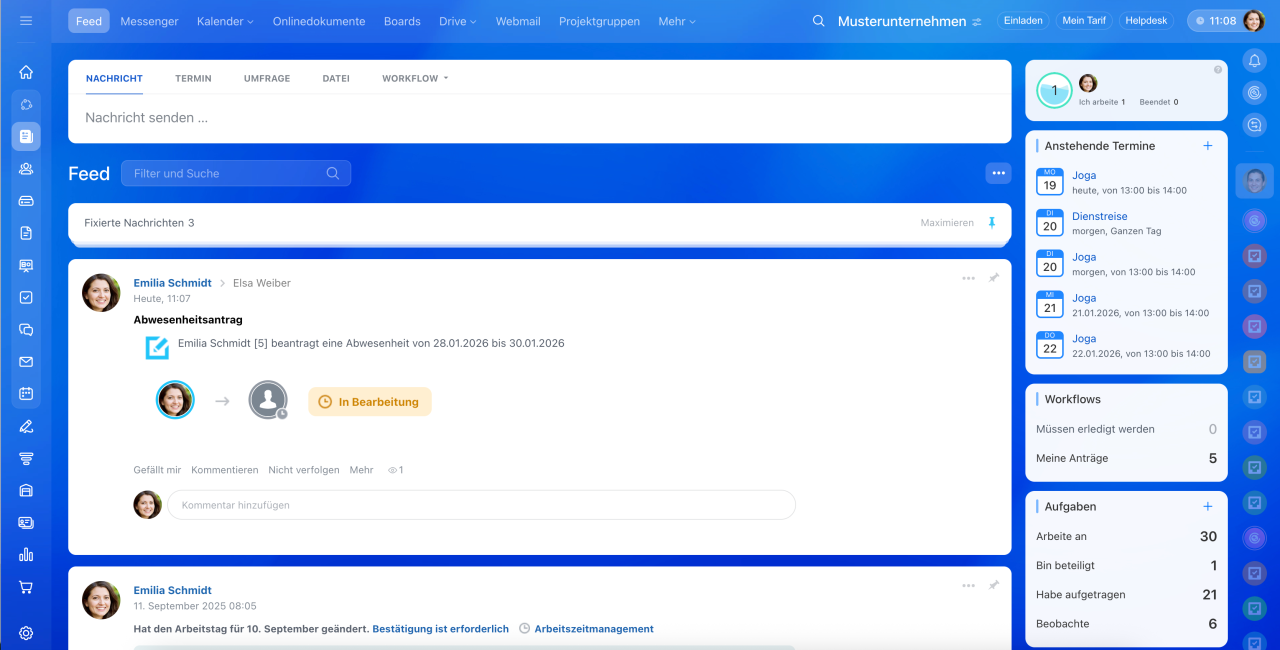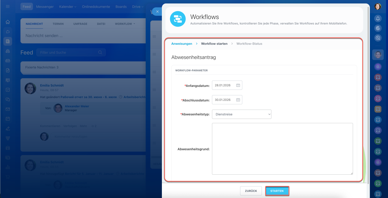 Abwesenheiten über Workflows eintragen: Klicken Sie auf Feed > Mehr > Workflows. Wählen Sie einen passenden Workflow aus, zum Beispiel Abwesenheitsantrag, und starten Sie ihn. Nach der Genehmigung des Workflows wird die Abwesenheit automatisch im Zeitplan angezeigt.