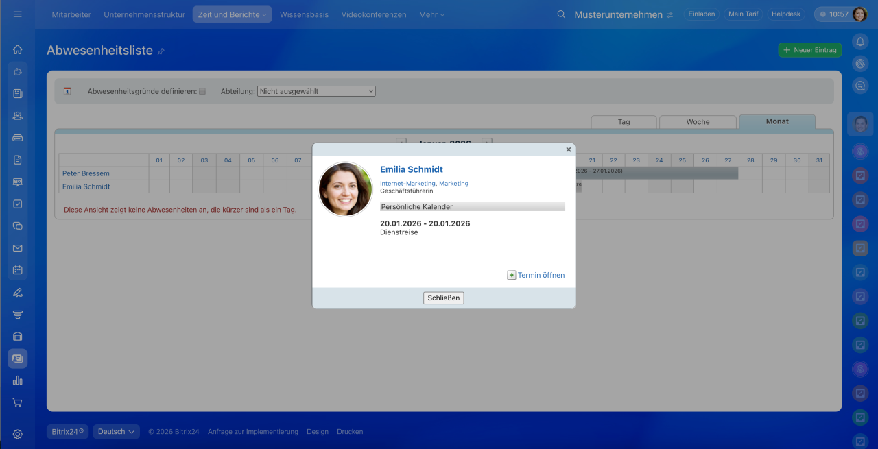 In der Cloud-Version von Bitrix24 können nur Bitrix24-Administratoren Abwesenheiten direkt im Zeitplan eintragen. Mitarbeiter haben die Möglichkeit, Abwesenheiten über einen Termin im Kalender oder über einen Workflow hinzuzufügen.