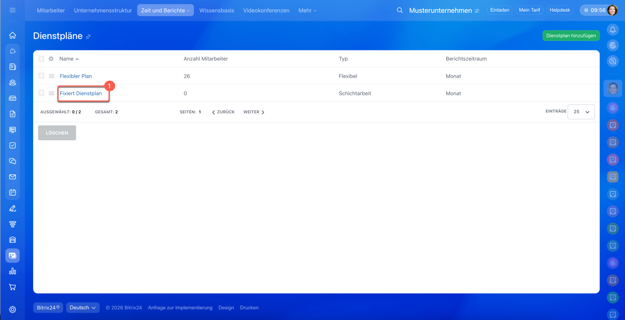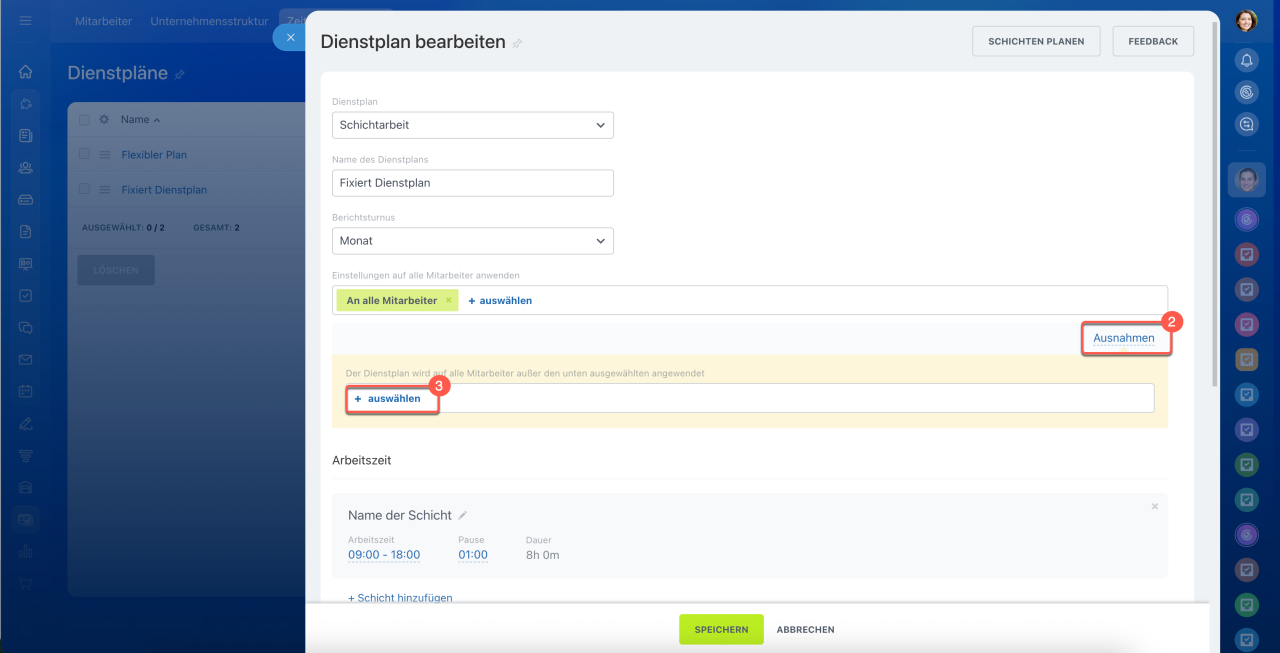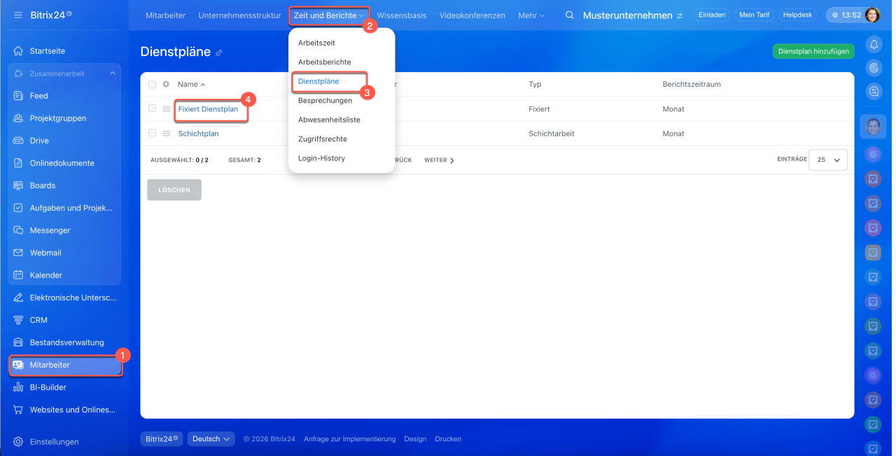 1–3. Öffnen Sie den Bereich Mitarbeiter > Zeit und Berichte > Dienstpläne.