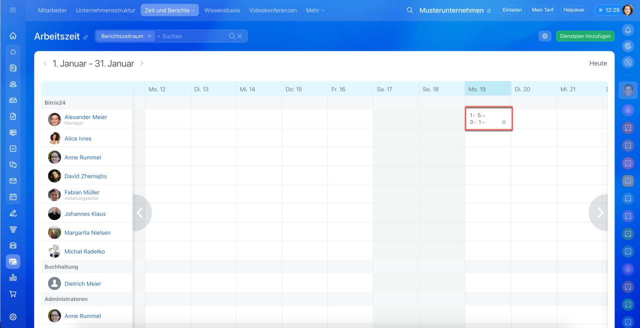 Lösungen: Korrigieren Sie die Arbeitszeit und überprüfen Sie die Einstellungen des Dienstplans. Ein Mitarbeiter kann nur seine eigene Arbeitszeit ändern. Vorgesetzte oder Bitrix24-Administratoren können sowohl die Arbeitszeit der Mitarbeiter als auch die Einstellungen des Dienstplans anpassen.