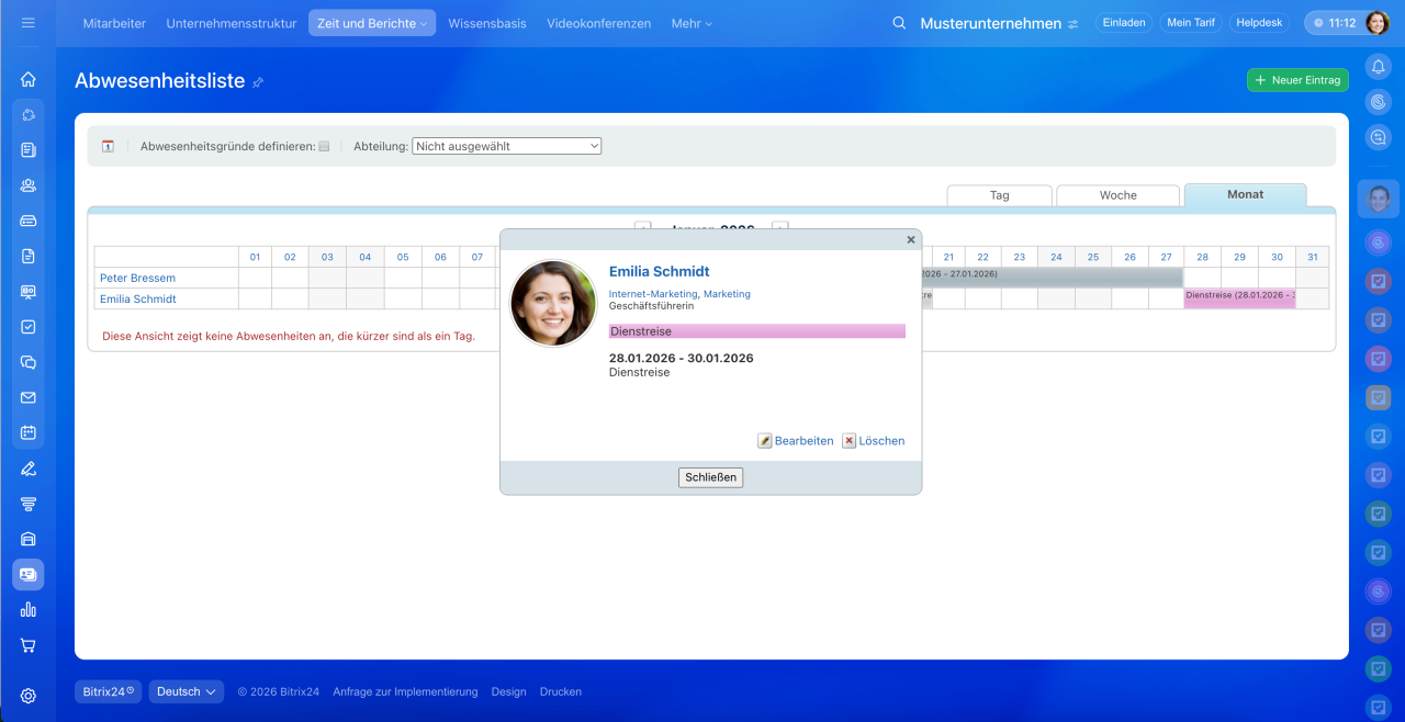 In der On-Premise-Version von Bitrix24 können Abwesenheiten im Zeitplan von Administratoren und Benutzern eingetragen werden, die der Gruppe Personalabteilung hinzugefügt wurden.