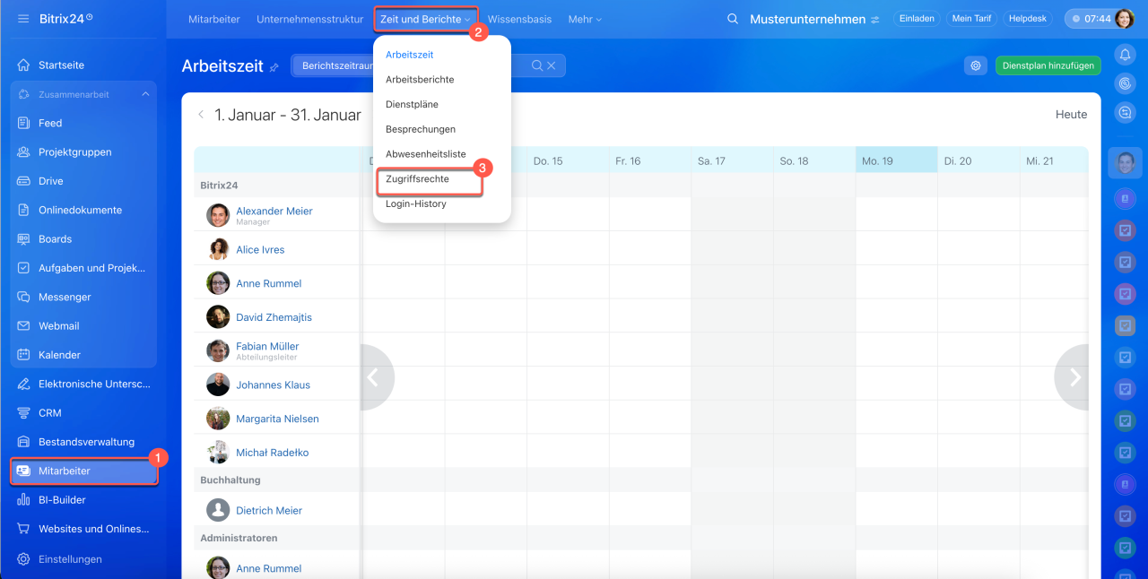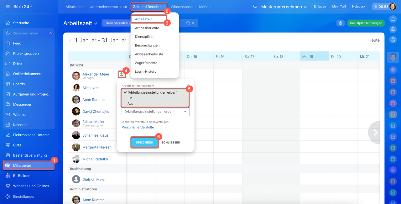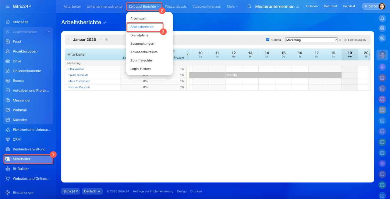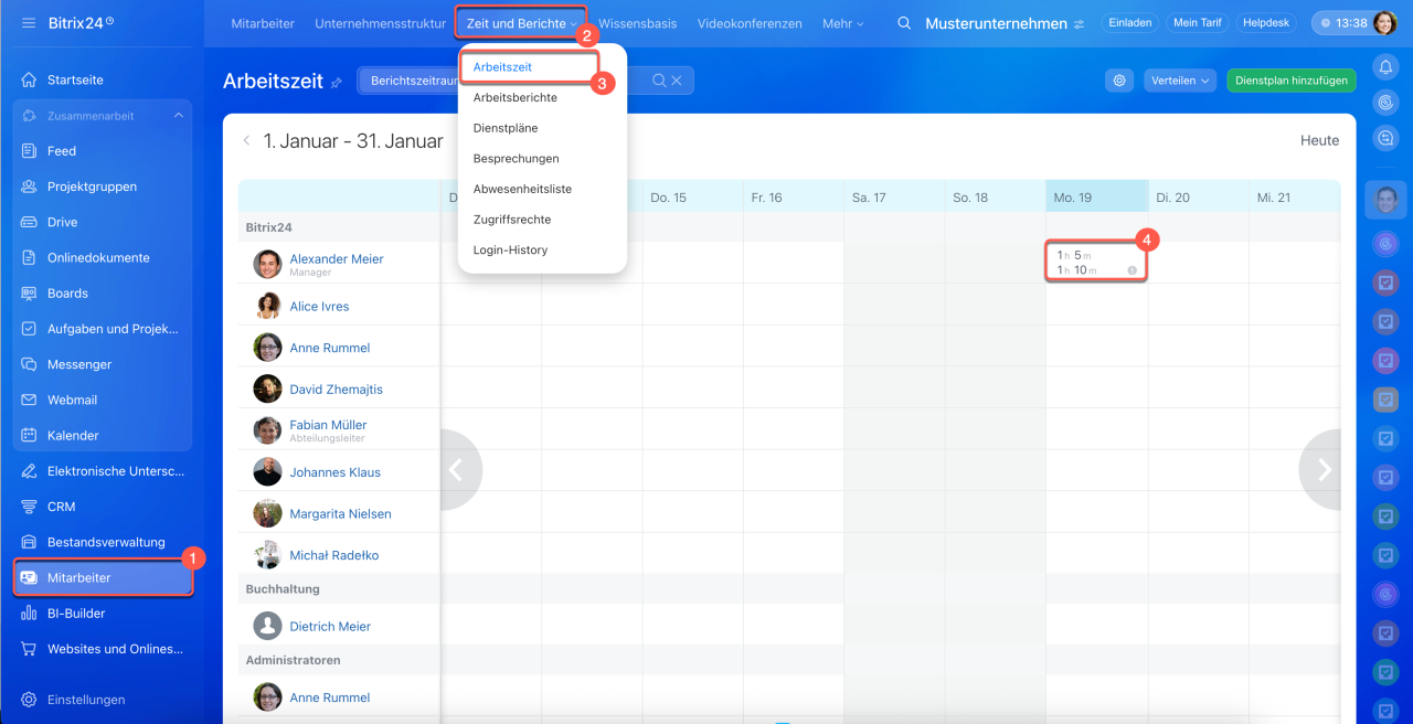 1–3. Öffnen Sie den Bereich Mitarbeiter > Zeit und Berichte > Arbeitszeit.