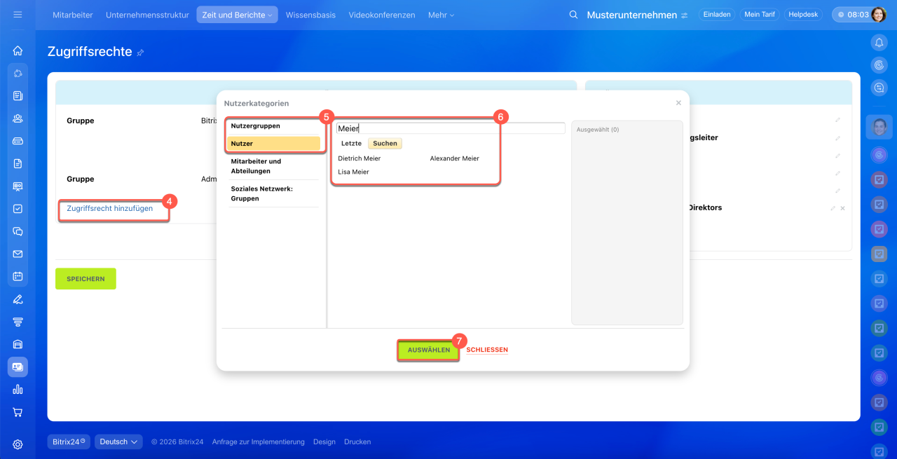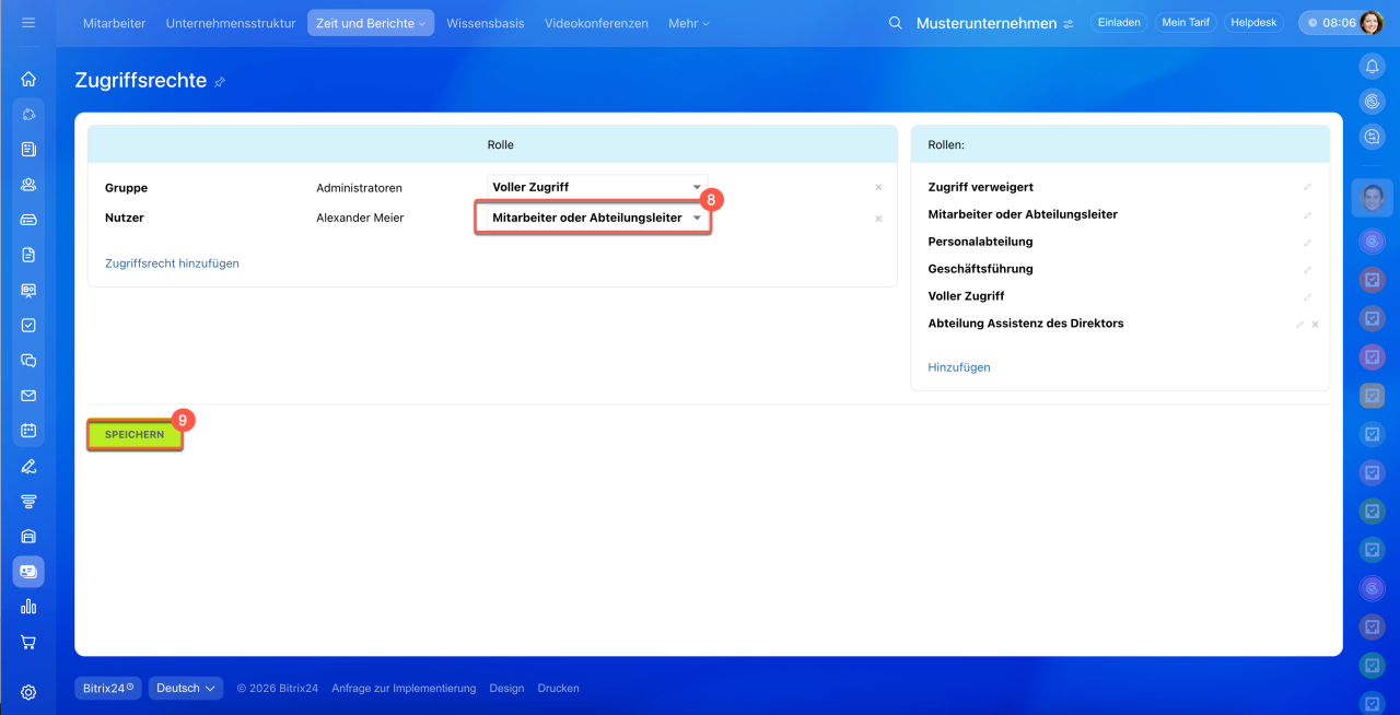 8. Wählen Sie das Zugriffsrecht Mitarbeiter oder Abteilungsleiter – es funktioniert unterschiedlich, je nach Rolle des Nutzers in der Unternehmensstruktur: