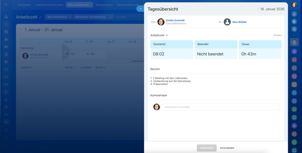 In Bitrix24 gibt es zwei Tools für die Berichterstattung über die Arbeit von Mitarbeitern: die Tagesübersicht im Bereich Arbeitszeit und den regelmäßigen Arbeitsbericht im Bereich Arbeitsberichte.