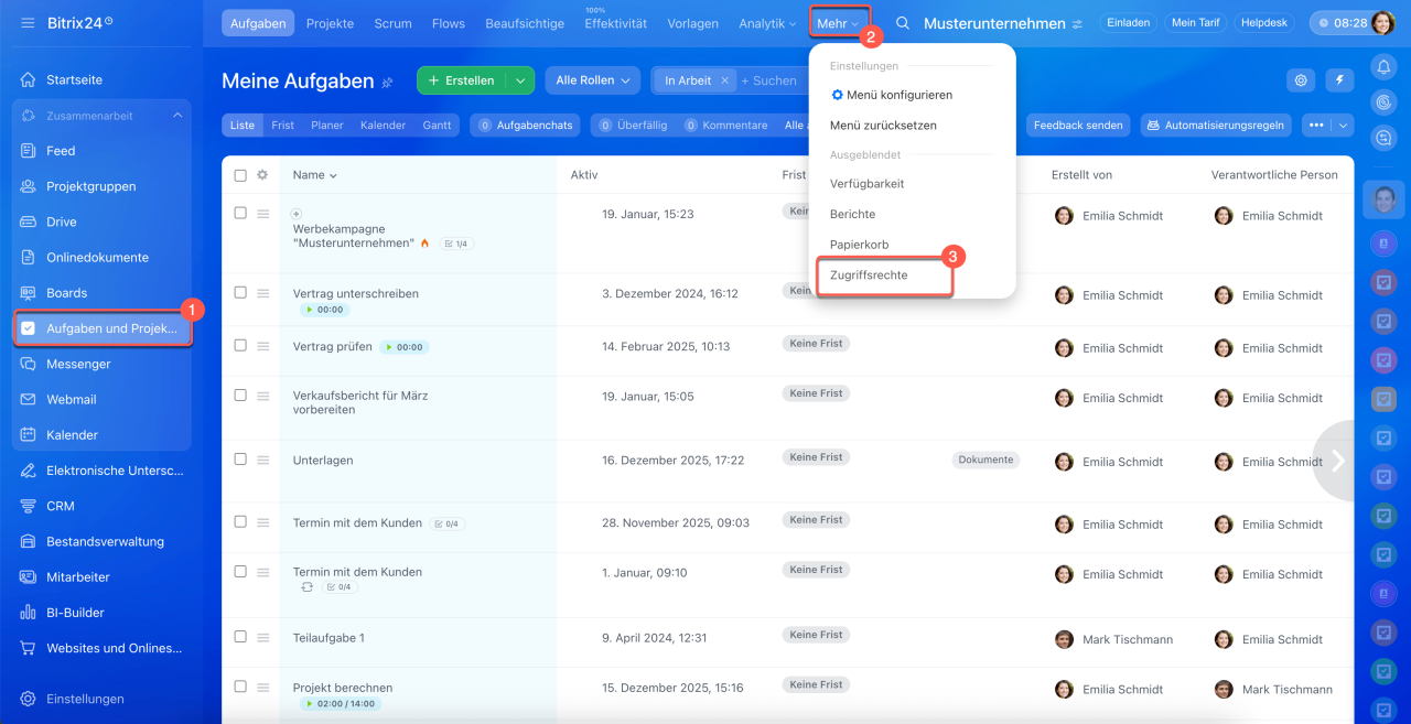 In Bitrix24 können Sie individuelle Zugriffsrechte für Aufgaben einrichten, um Arbeitsabläufe in Ihrem Unternehmen klar zu strukturieren. Durch die Zuweisung von Rollen an Mitarbeiter oder Abteilungen schaffen Sie eine transparente und sichere Zusammenarbeit. Ob Projektmanager, Teamleiter oder Mitarbeiter – mit den richtigen Berechtigungen behält jeder die Kontrolle über seine Aufgaben, ohne die Sicherheit des Systems zu gefährden.