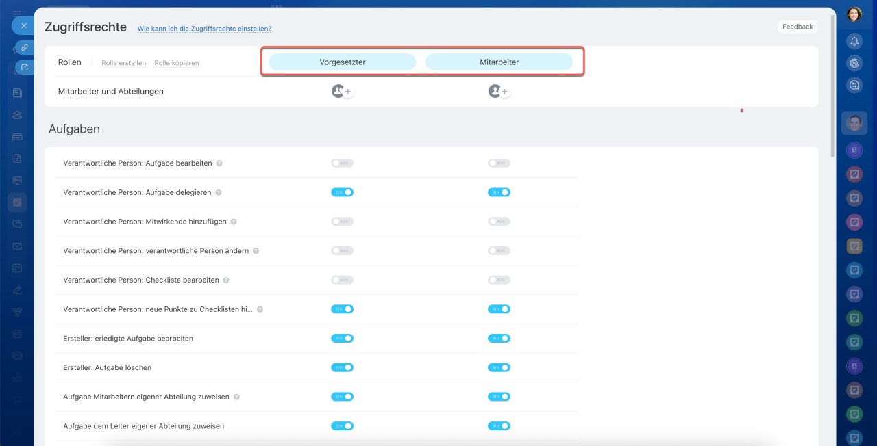 - Bitrix24 bietet zwei vorinstallierte Rollen mit unterschiedlichen Rechten. Sie können jedoch eine unbegrenzte Anzahl von neuen Rollen hinzufügen oder die vorhandenen kopieren.