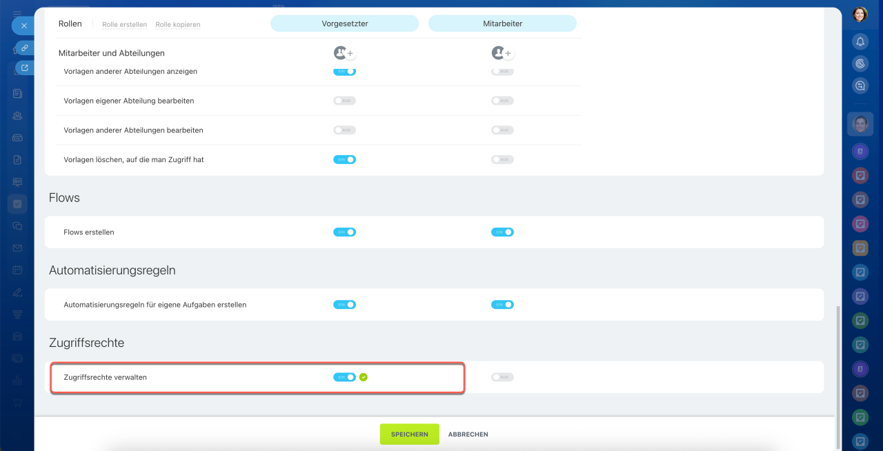 | Vorlagen | Legt fest, wer Aufgabenvorlagen anzeigen, bearbeiten oder löschen darf. |