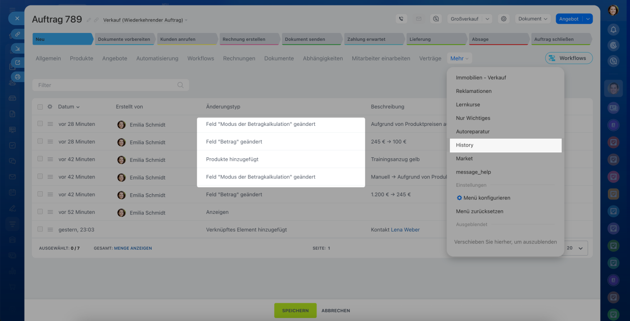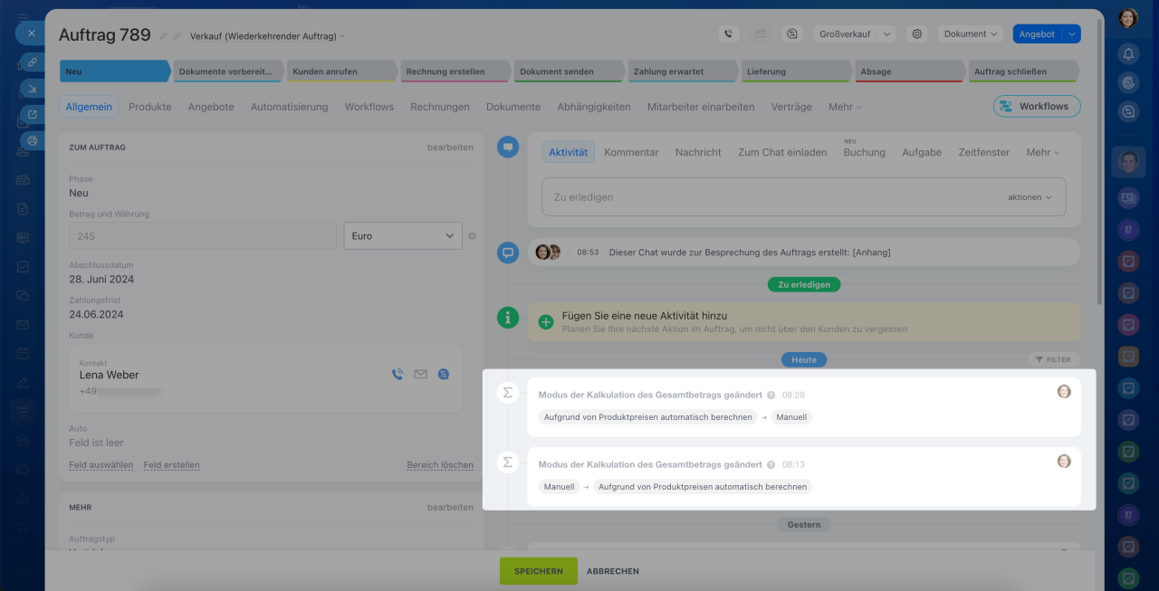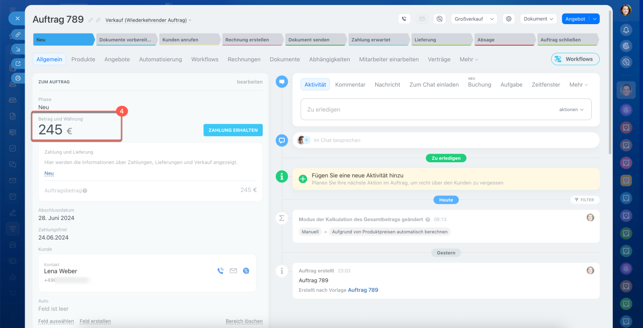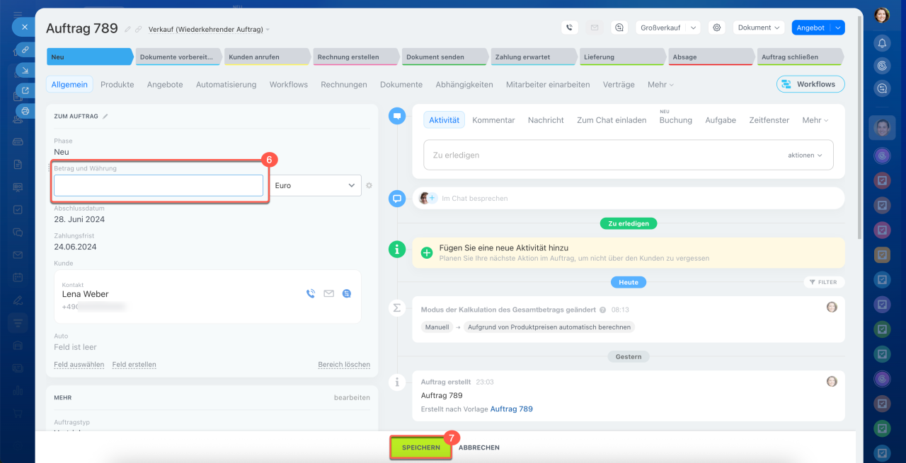 Beispiel: Sobald das Budget finalisiert ist, trägt der Manager alle Produkte und Dienstleistungen in den Auftrag ein. Ändert der Kunde später den Umfang oder fügt eine neue Position hinzu, aktualisiert das CRM den Betrag sofort. So bleibt die Summe immer aktuell, und die Erstellung von Dokumenten wird beschleunigt.