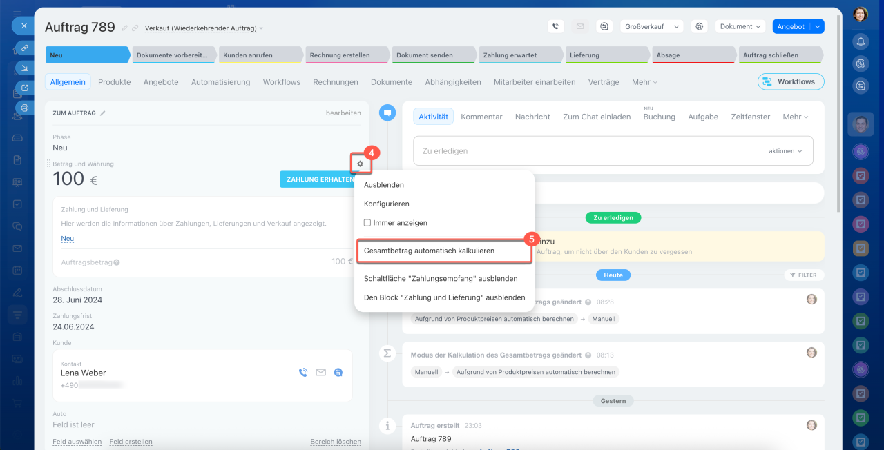 Im Auftragsformular können Sie festlegen, wie der Betrag berechnet wird: entweder manuell oder automatisch – basierend auf den ausgewählten Produkten und Dienstleistungen. So können Sie bereits zu Beginn des Gesprächs einen vorläufigen Betrag angeben und später, sobald der genaue Arbeitsumfang feststeht, eine präzise Berechnung durchführen.