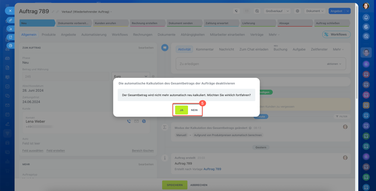 Wenn bereits Produkte hinzugefügt wurden, fragt das CRM, ob die automatische Berechnung deaktiviert werden soll.