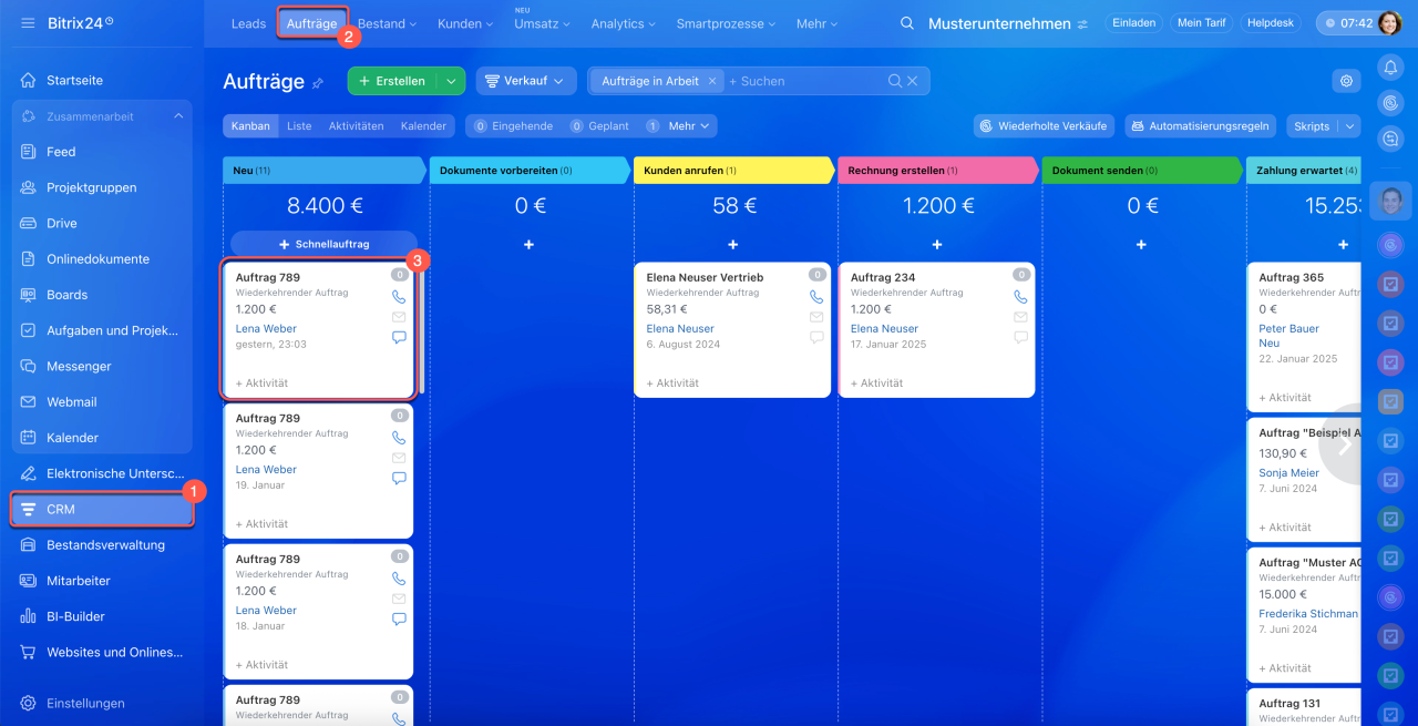 1–3. Gehen Sie zu CRM > Aufträge und öffnen Sie den gewünschten Auftrag.