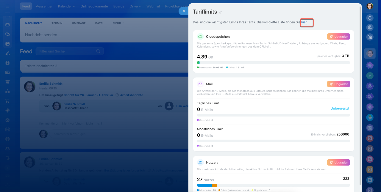 Monatliche Limits für ausgehende E-Mails aus Bitrix24 - Nutzer: Anzahl der Mitarbeiter und externen Nutzer, die im Tarif verfügbar sind, sowie die bereits registrierten Nutzer in Ihrem Bitrix24.
