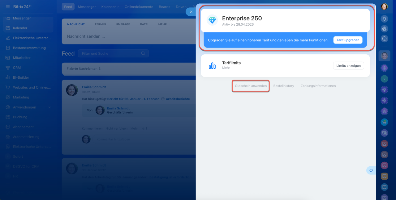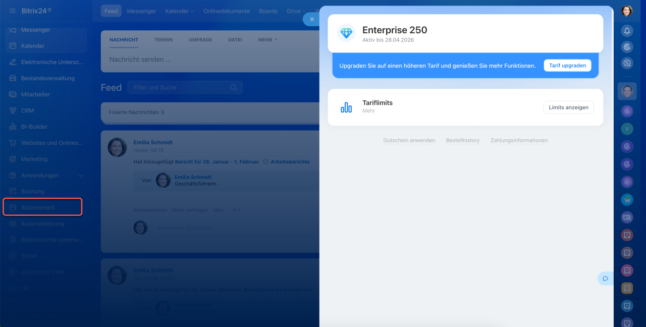 In Bitrix24 wurde der Bereich Abonnement aktualisiert. Dieser ist besonders hilfreich, wenn Sie: