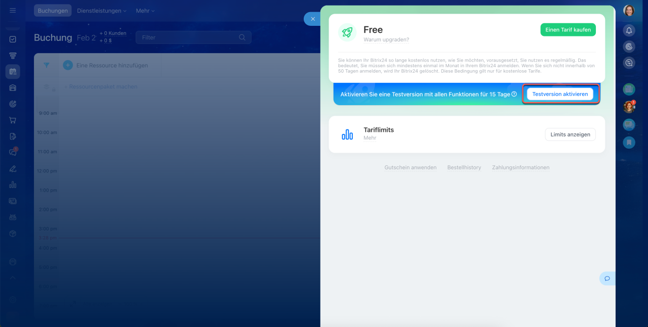 Testversion: Nutzen Sie 15 Tage lang alle Funktionen des kostenpflichtigen Tarifs Professional. Aktivieren Sie die Testversion, um die Bitrix24-Tools vor dem Kauf ausführlich zu testen.