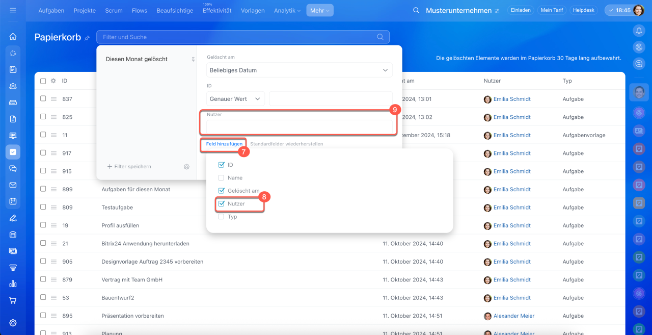 7–9. Als Bitrix24-Administrator können Sie zusätzlich nach gelöschten Aufgaben bestimmter Mitarbeiter filtern: Fügen Sie das Feld Nutzer hinzu und wählen Sie den gewünschten Mitarbeiter aus.