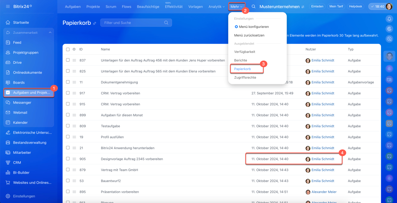 1–4. Öffnen Sie den Bereich Aufgaben und Projekte > Mehr > Papierkorb. In der angezeigten Liste finden Sie alle gelöschten Aufgaben – inklusive Informationen, wer sie wann gelöscht hat.