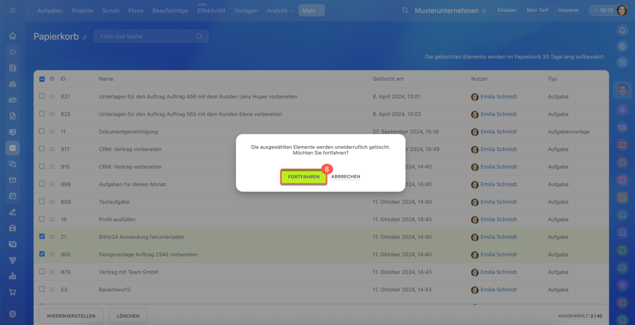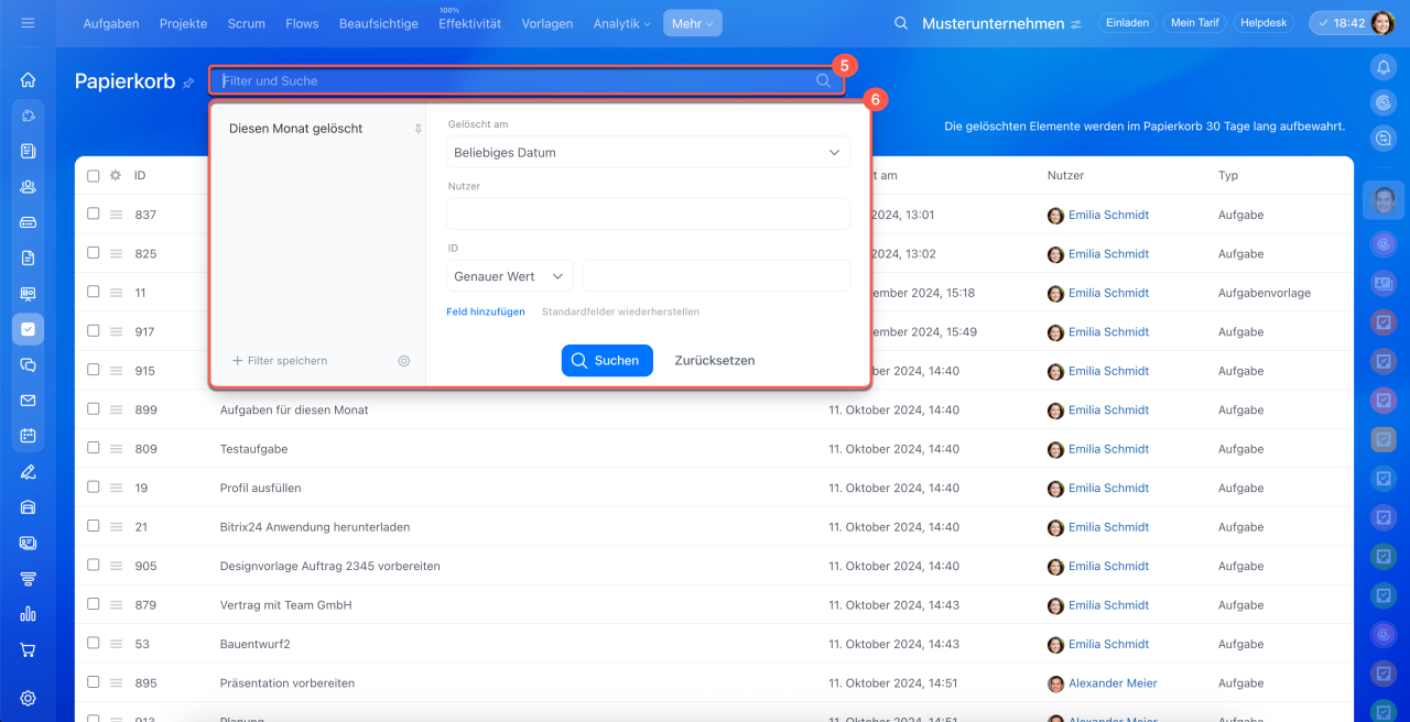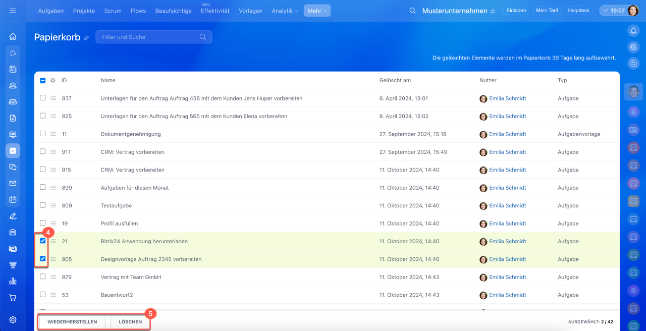 - In Bitrix24 gelangen gelöschte Aufgaben zunächst in den Papierkorb.