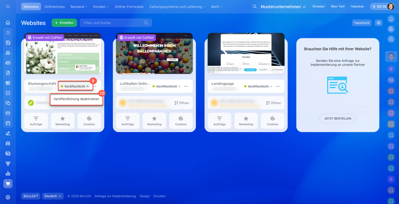 9–10. Veröffentlichen Sie die Website erneut, damit die Einstellungen korrekt angewendet werden. Klicken Sie auf den Status der Website, deaktivieren Sie die Veröffentlichung und veröffentlichen Sie die Website erneut.