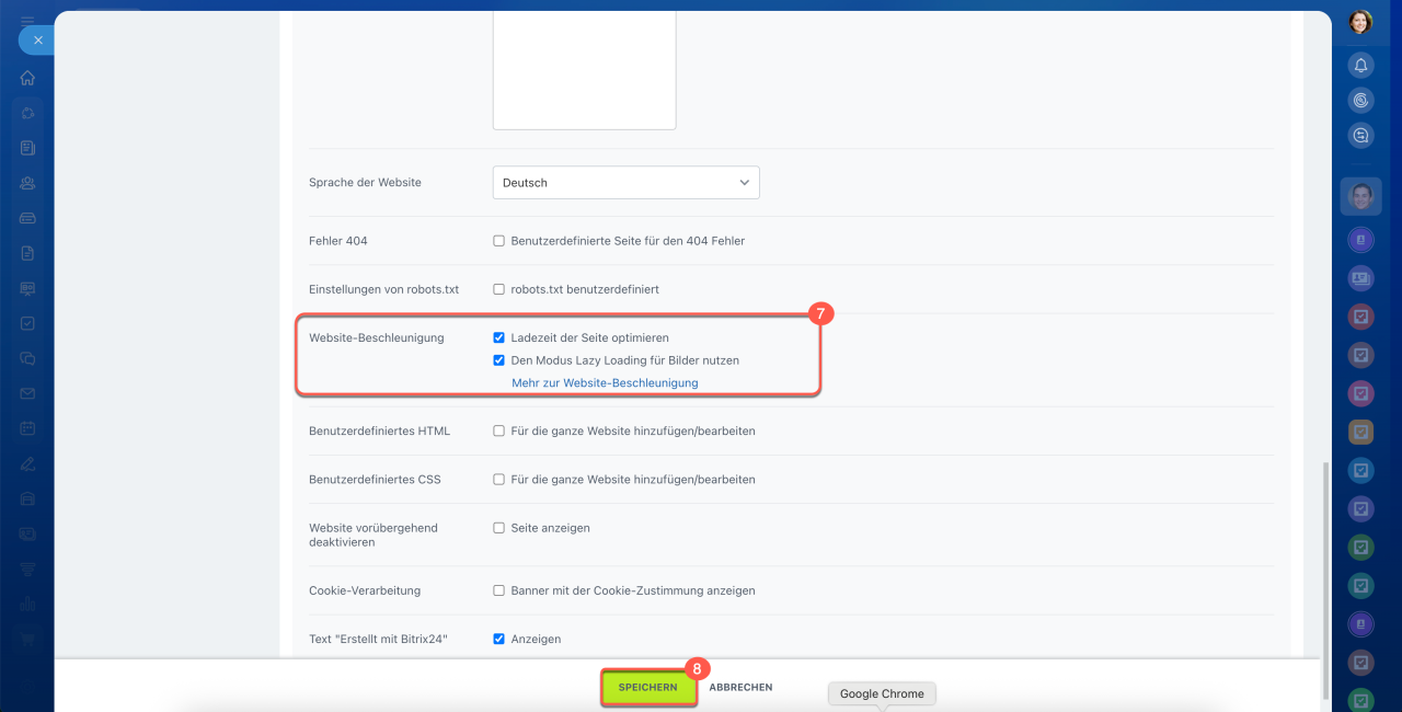 6–7. Aktivieren Sie im Bereich Website-Beschleunigung die Optionen Ladezeit der Seite optimieren und Den Modus Lazy Loading für Bilder nutzen.