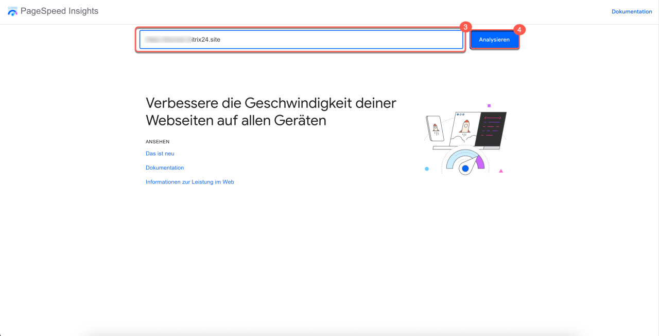 3–4. Geben Sie die URL der Website auf der Seite des Online-Tools ein und starten Sie den Test.