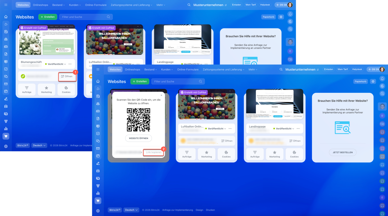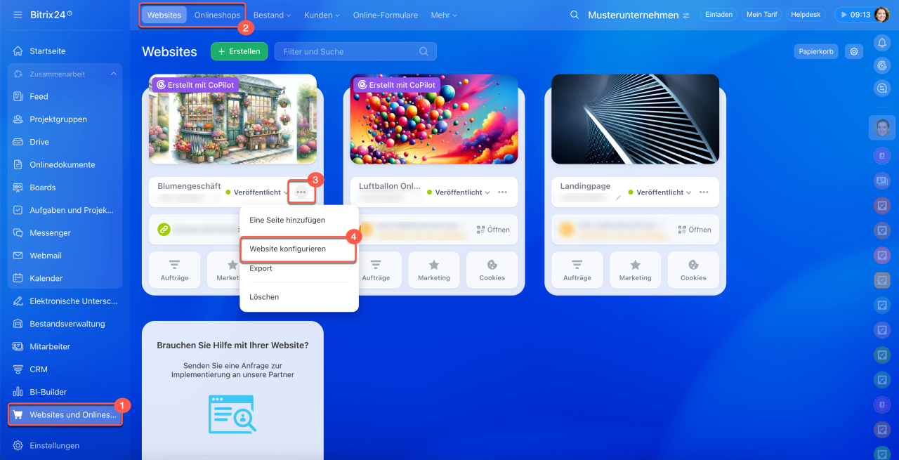 1–2. Öffnen Sie den Bereich Websites und Onlineshops und wählen Sie den Tab Websites oder Onlineshops.