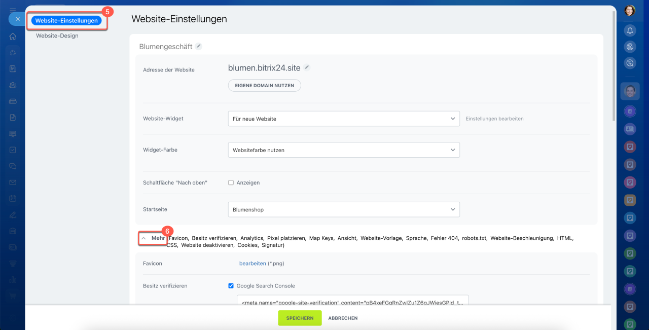 4–5. Gehen Sie im Tab Website-Einstellungen auf Mehr.
