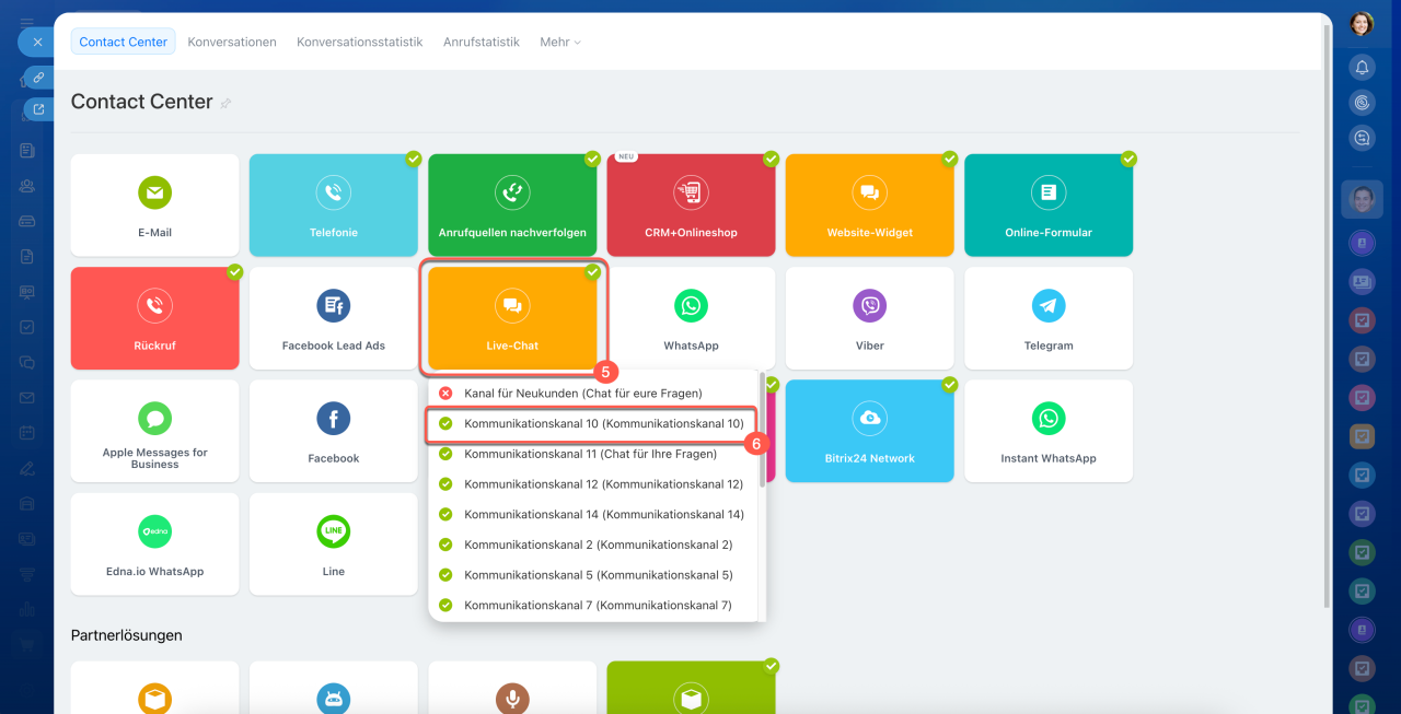 5–6. Wählen Sie den Kanal aus, den Sie einrichten möchten – zum Beispiel Live-Chat oder Instagram.